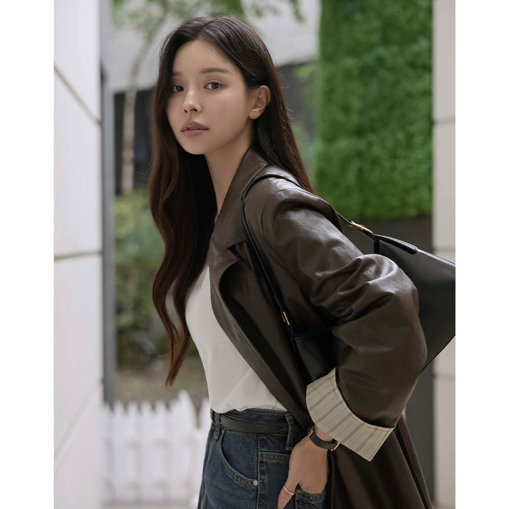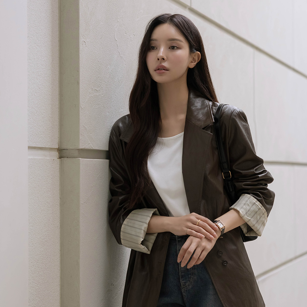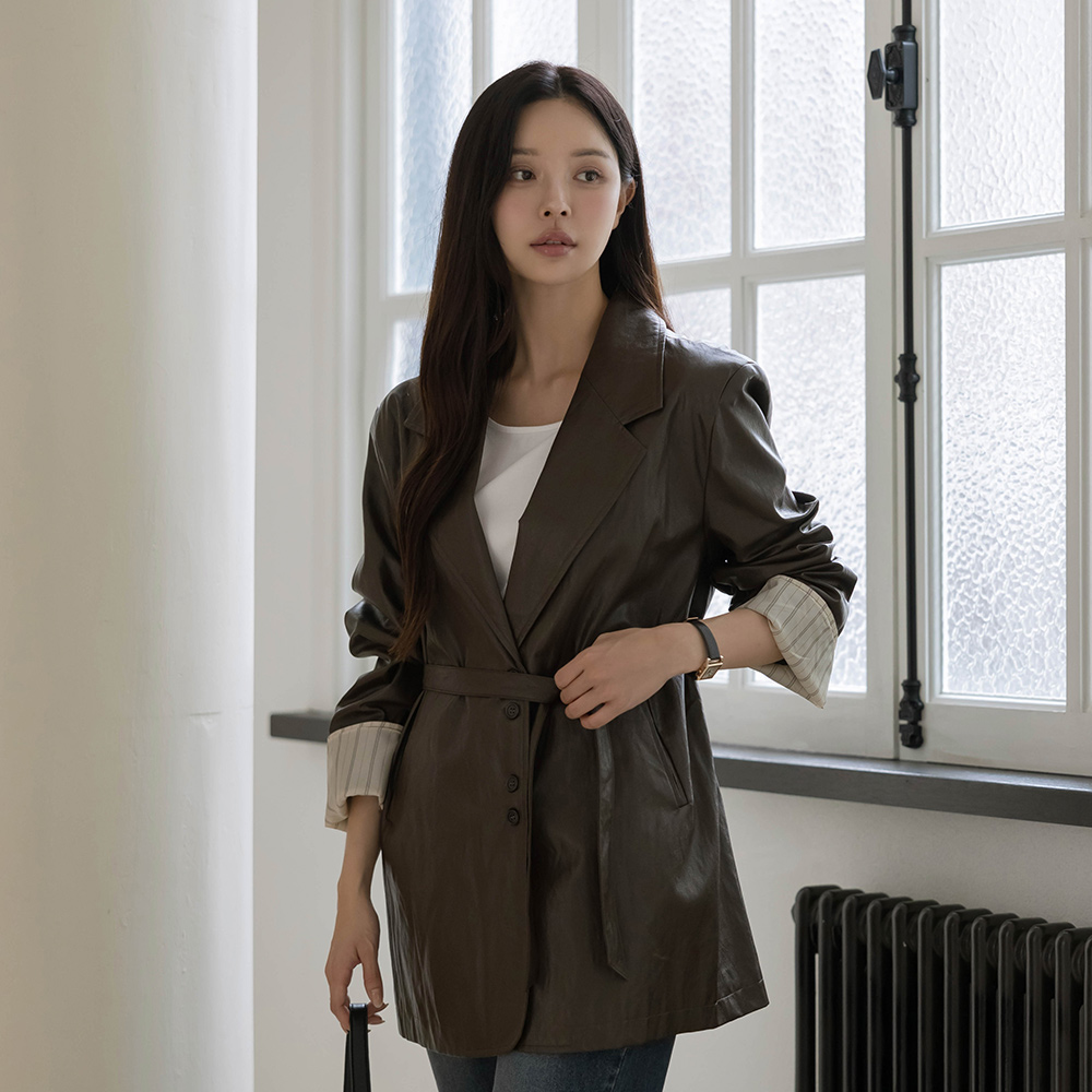 袖 配色 宽松款 人造皮夹 夹克(+腰带)