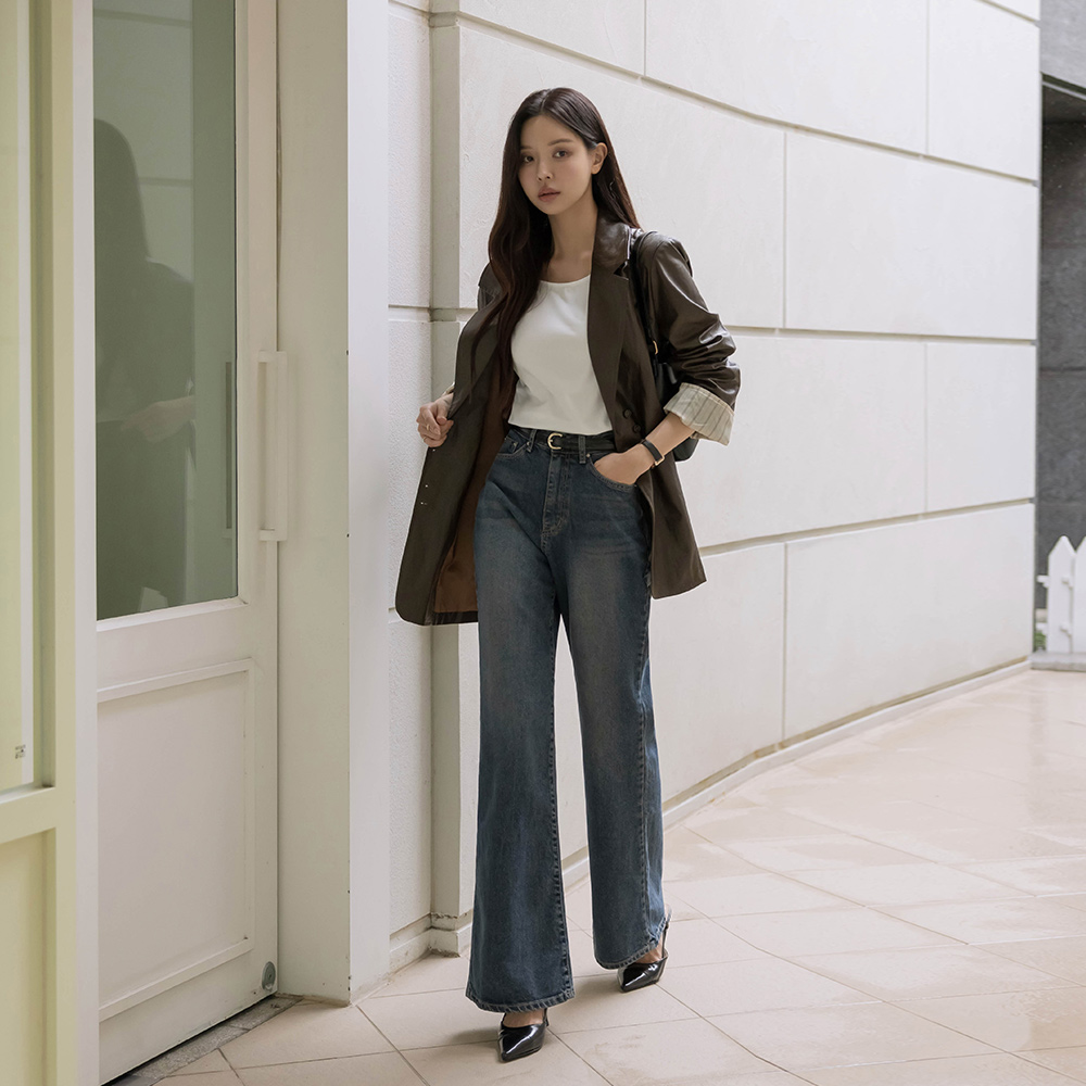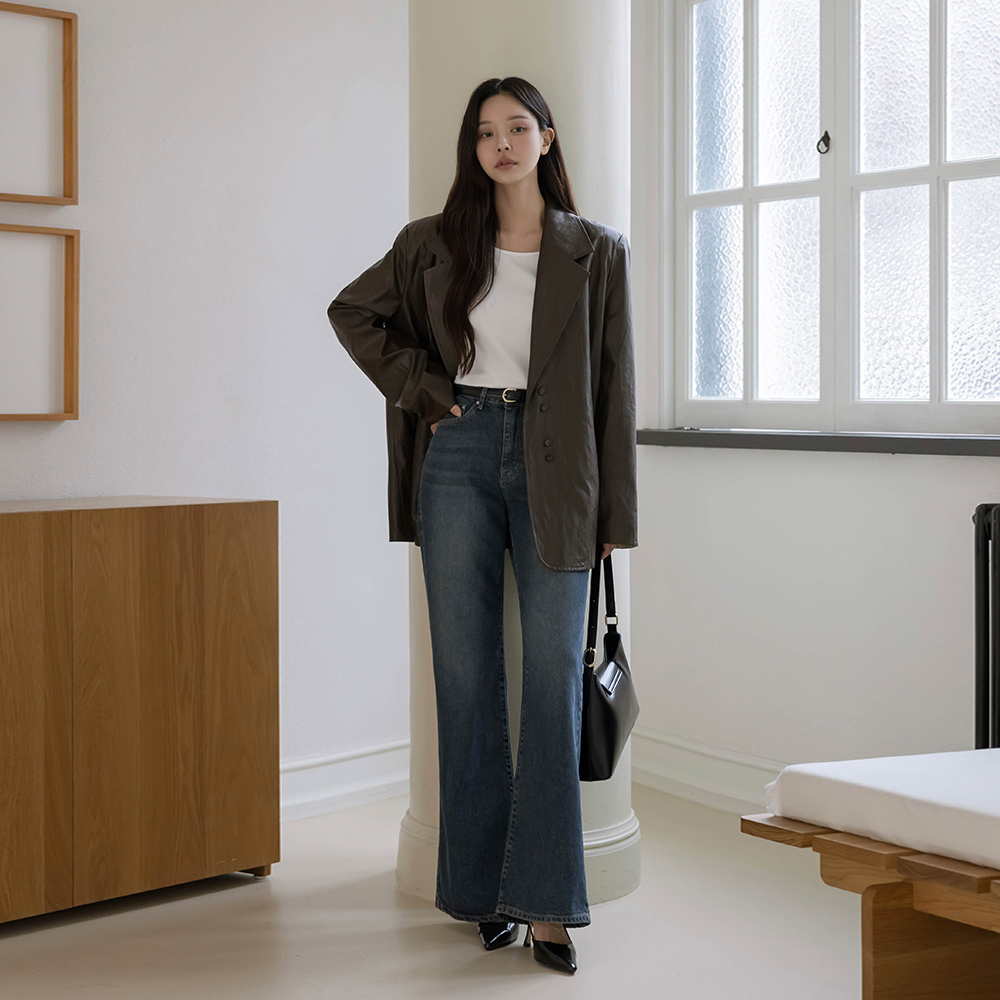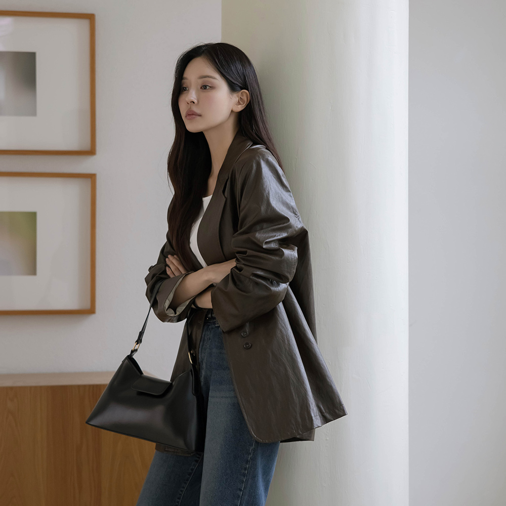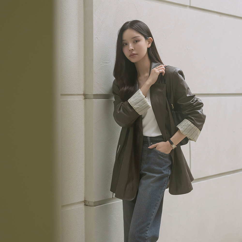 袖 配色 宽松款 人造皮夹 夹克(+腰带)