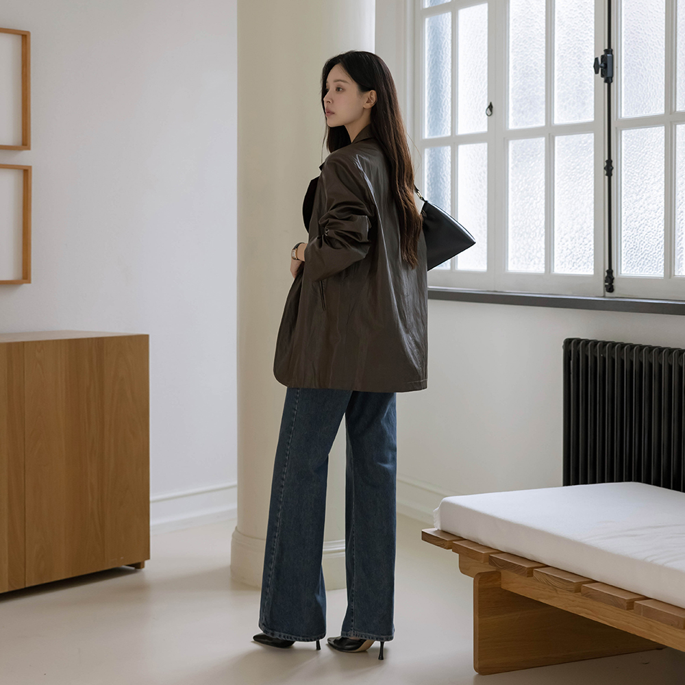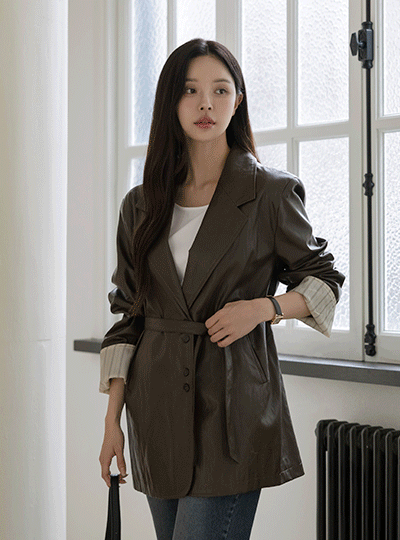 袖 配色 宽松款 人造皮夹 夹克(+腰带)