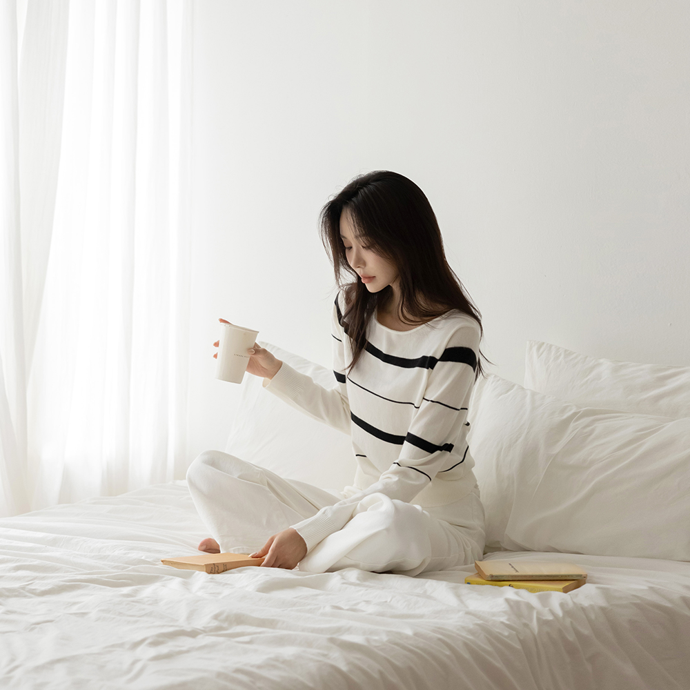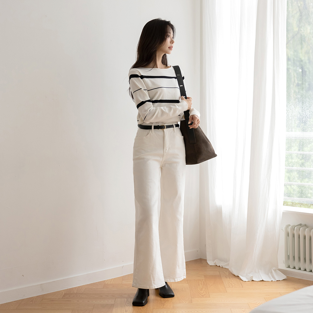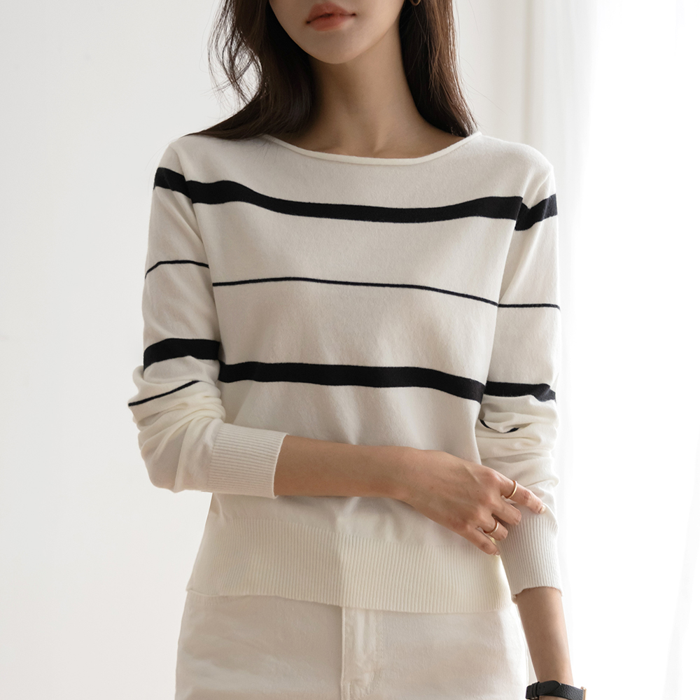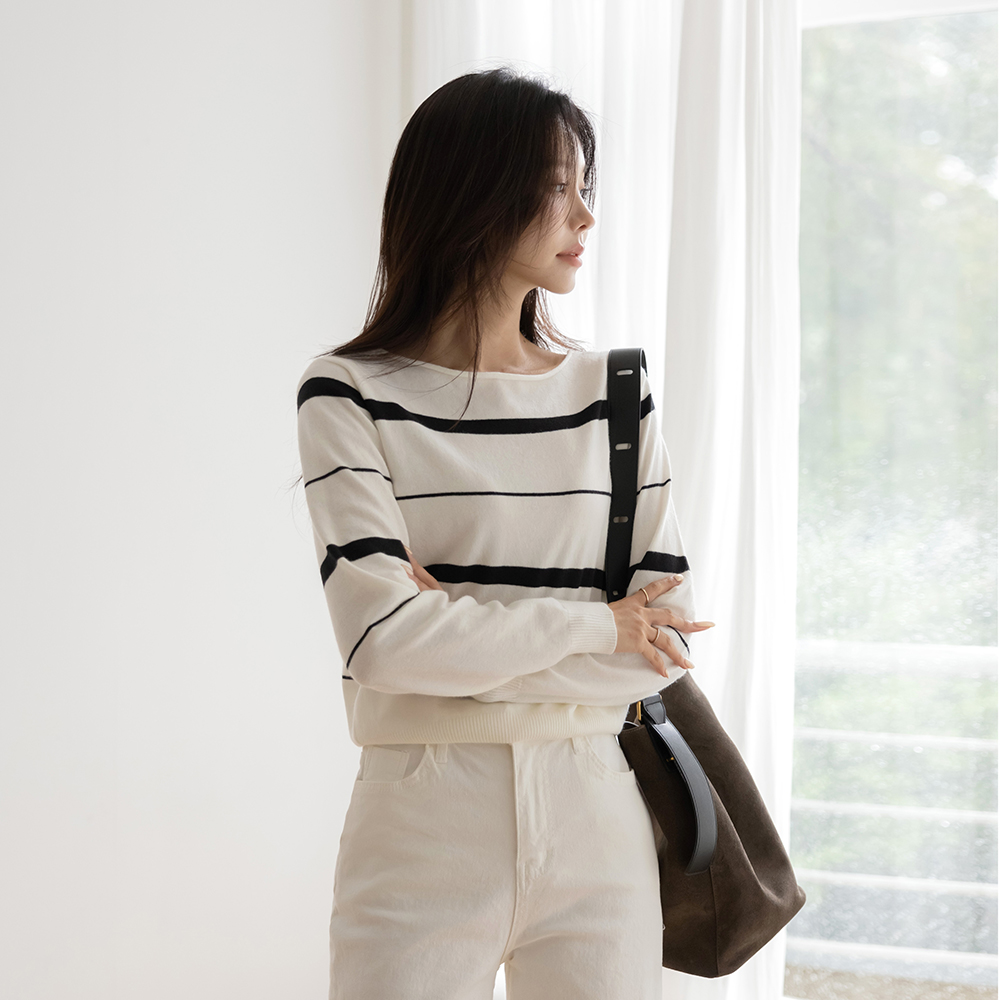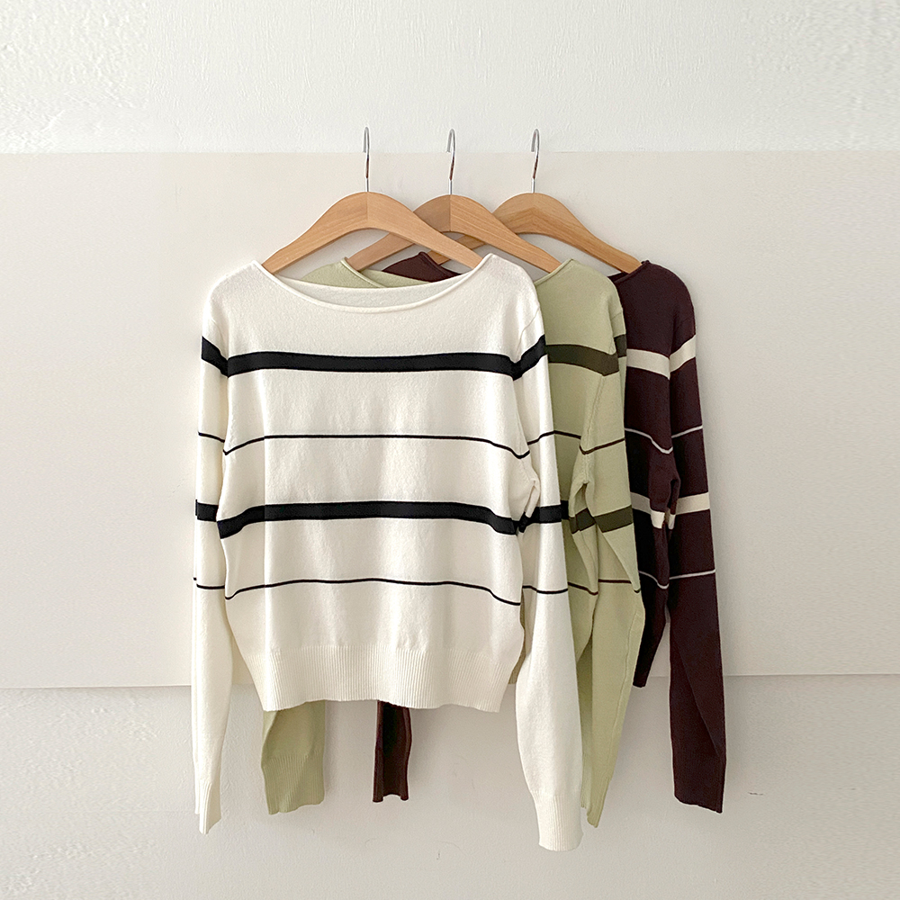 苗条 船形领 条纹 羊毛 针织衫