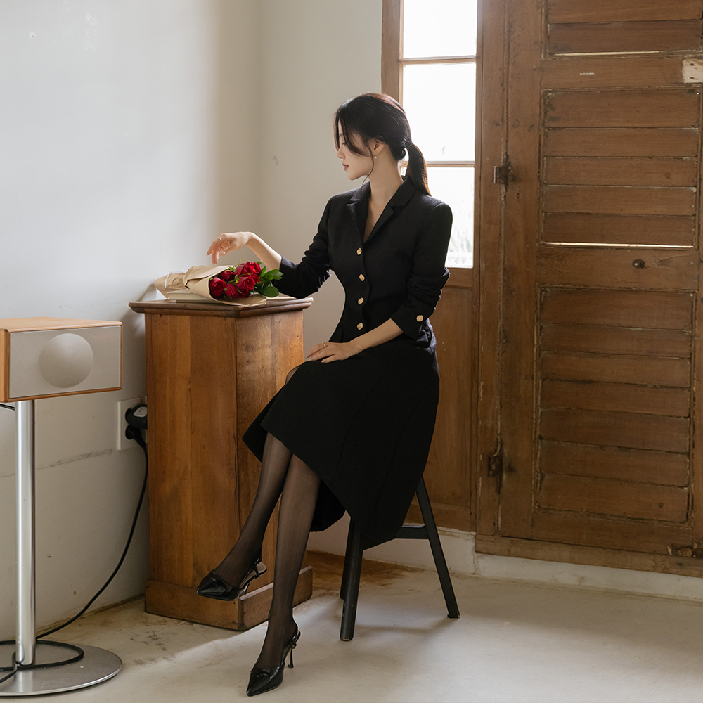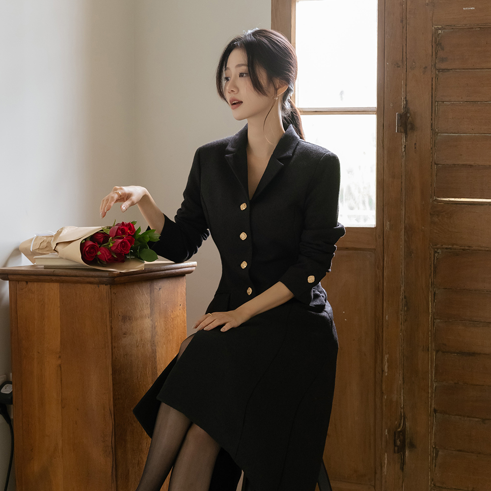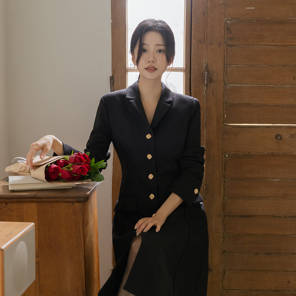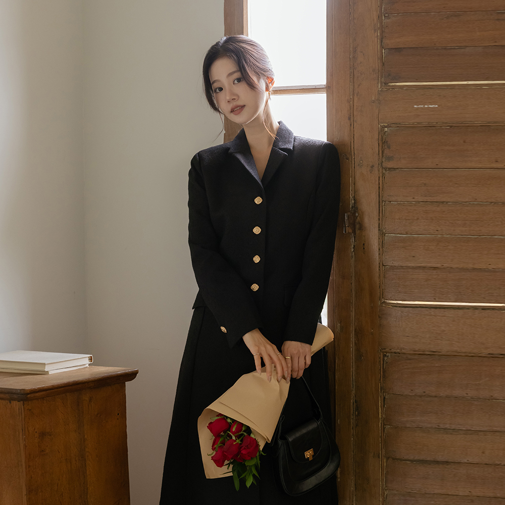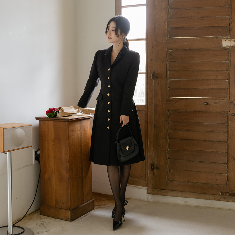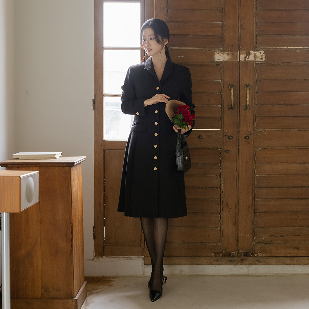 翻领 金色纽扣 A字型 粗呢 连衣裙