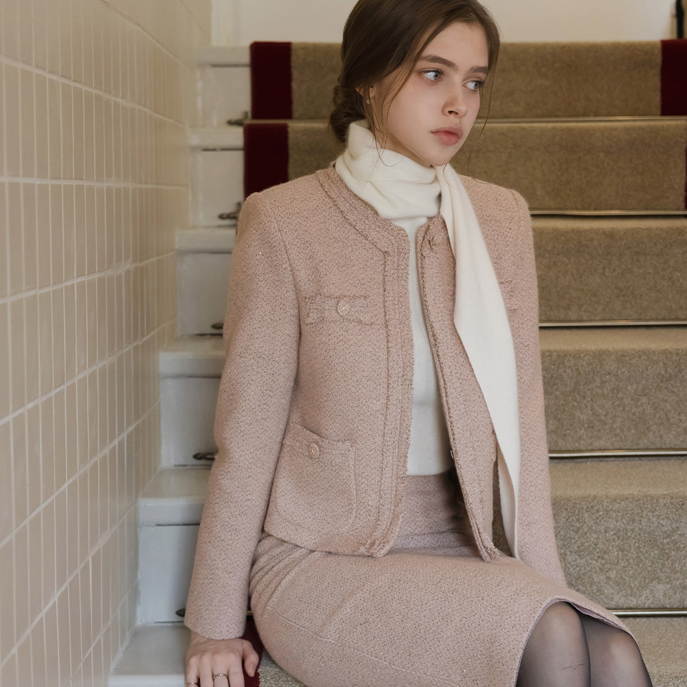 玫瑰色 混合 羊毛 穗饰 粗呢 Set-up 夹克