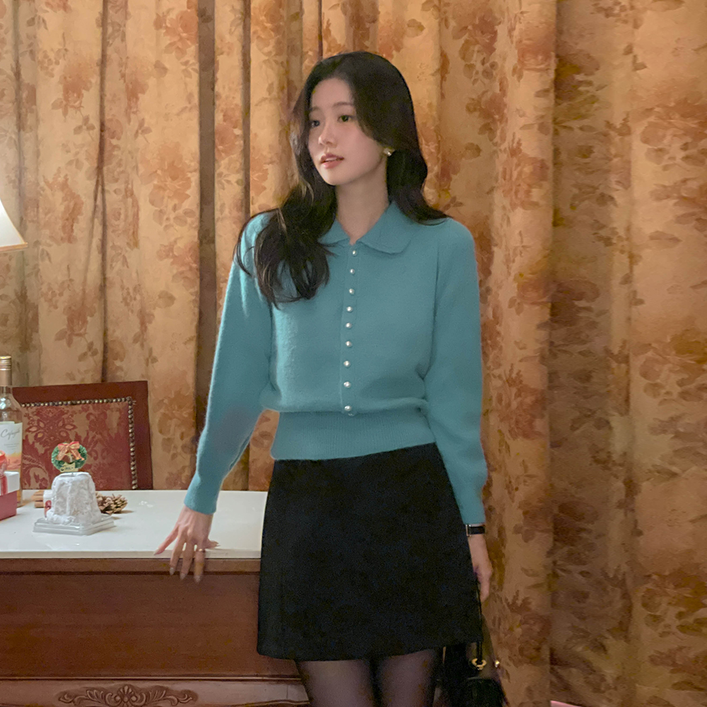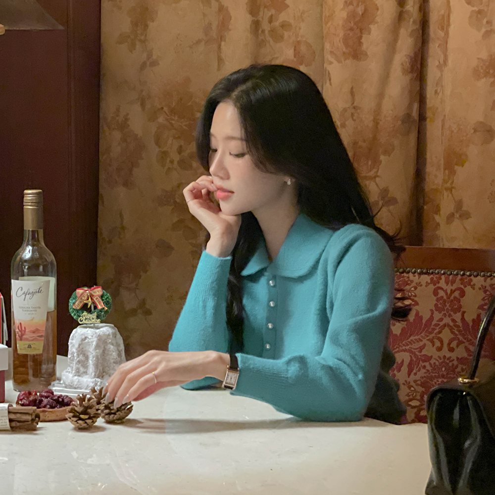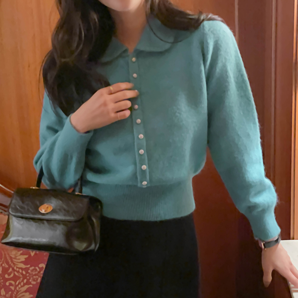 颜色 点缀 翻领 珍珠扣 针织衫
