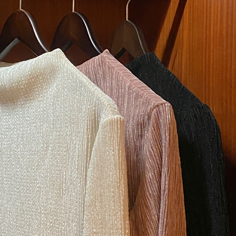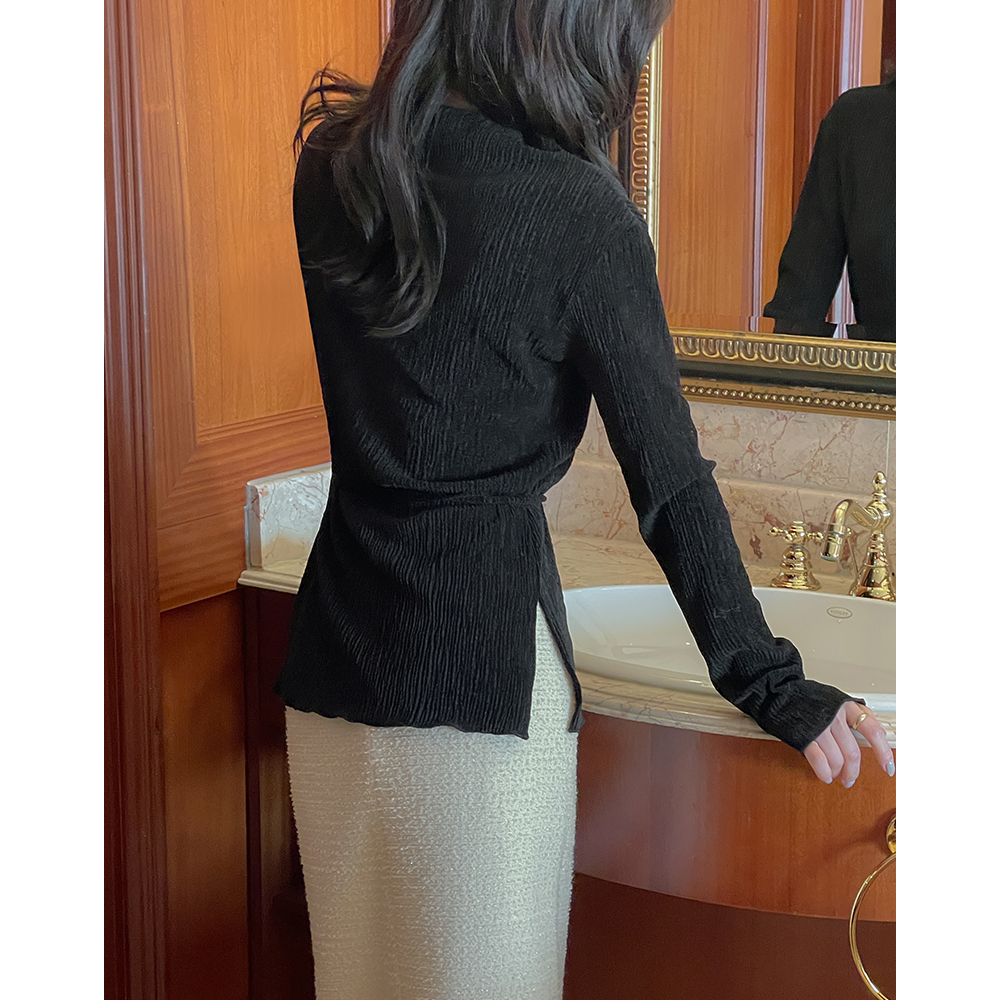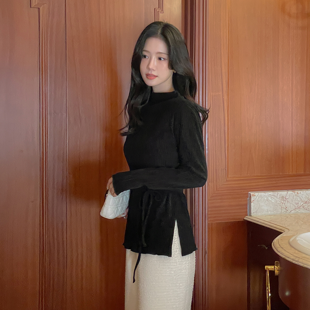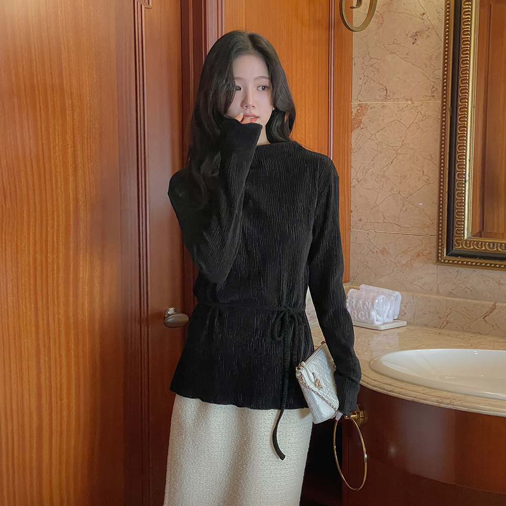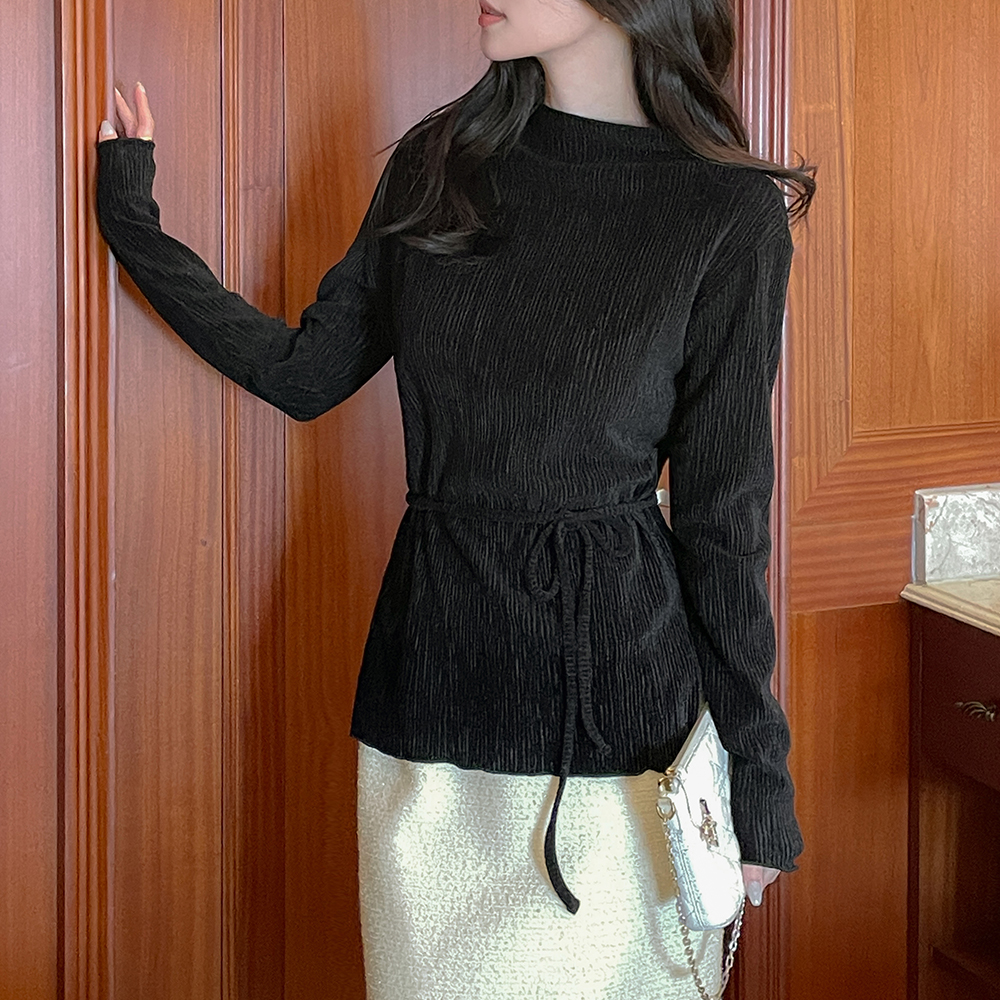 亮片 丝绒 半高领 去皱纹 弹力 T恤衫(+腰带)