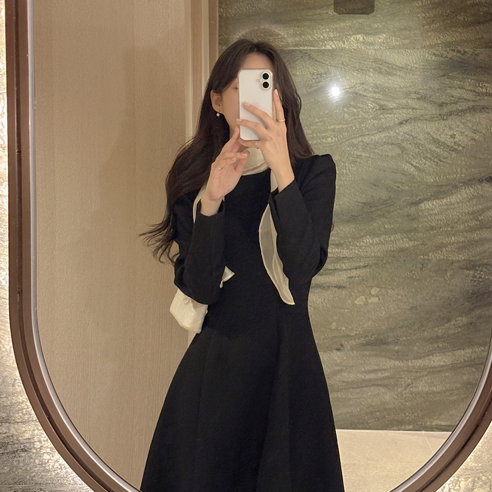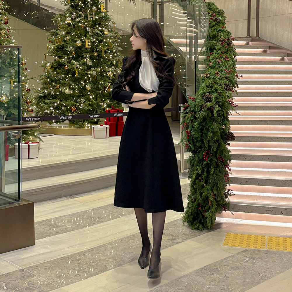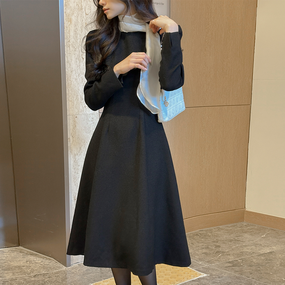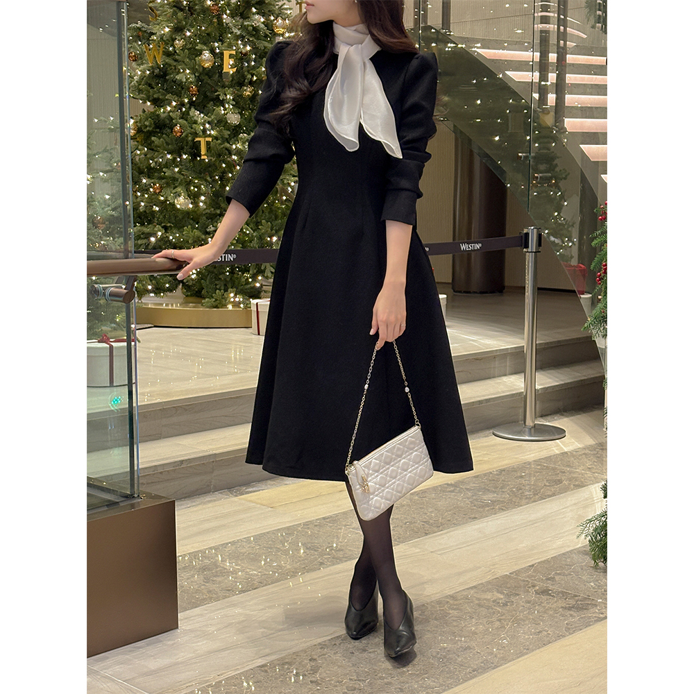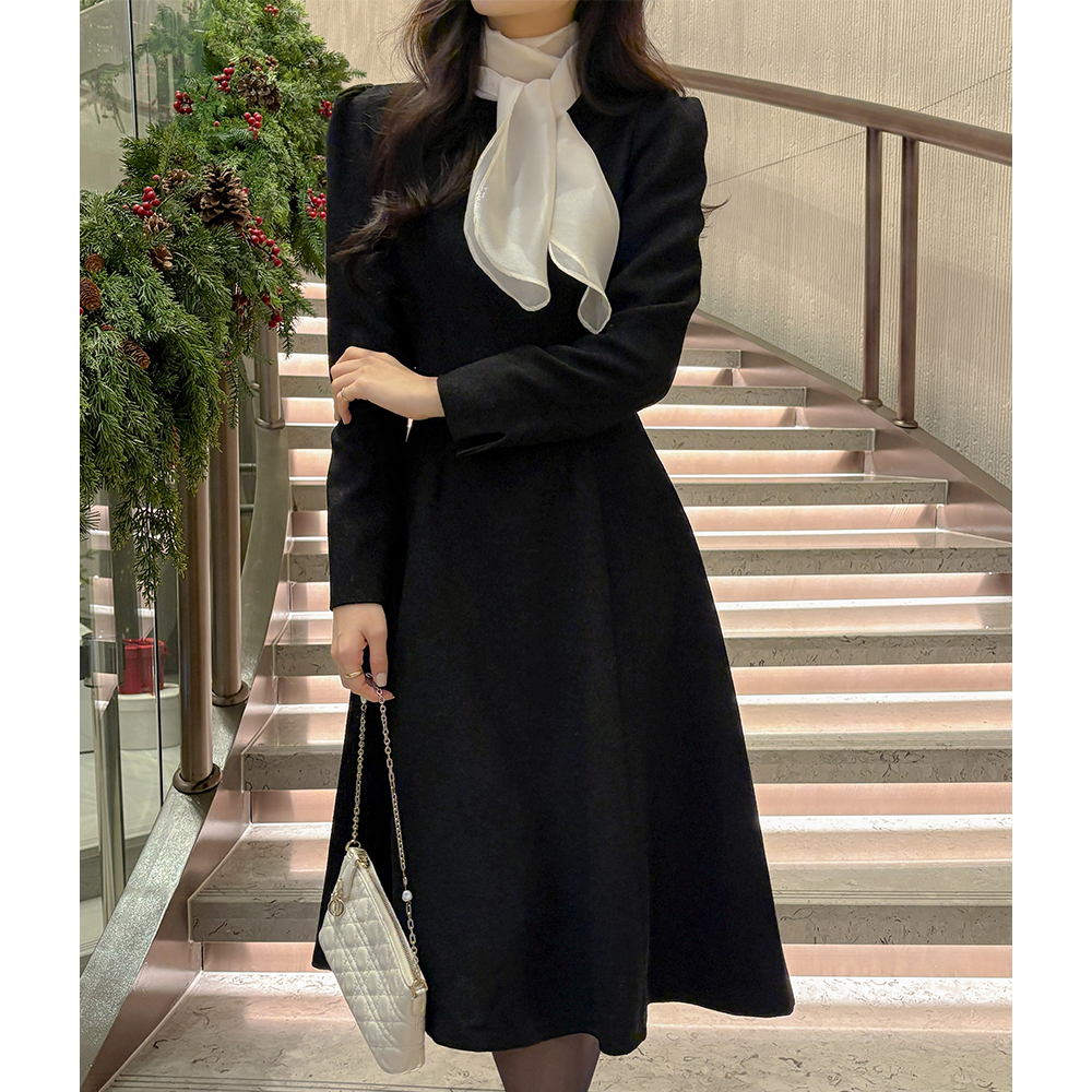 女性化的 围巾领 粗呢 A字型 连衣裙