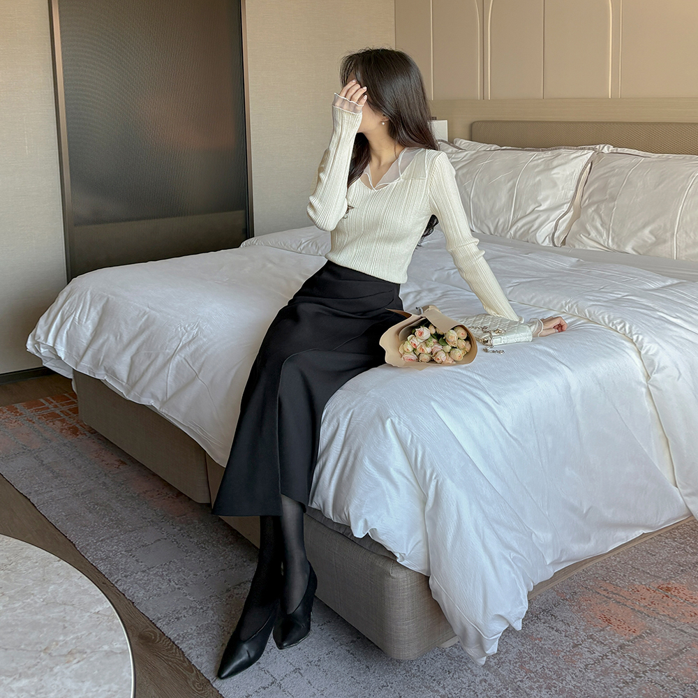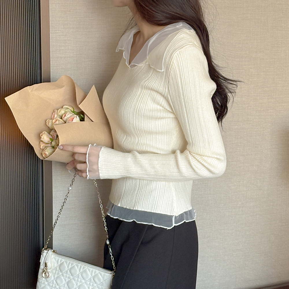 透视 配色 领子 苗条 针织衫