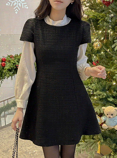 闪亮 短袖 粗呢 A字型 迷你 连衣裙