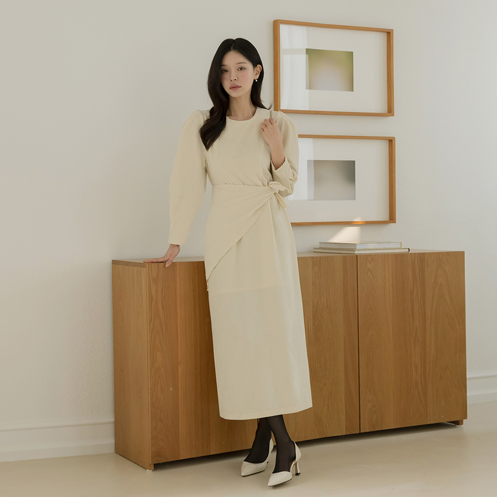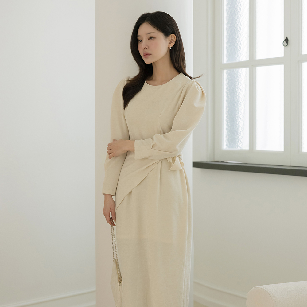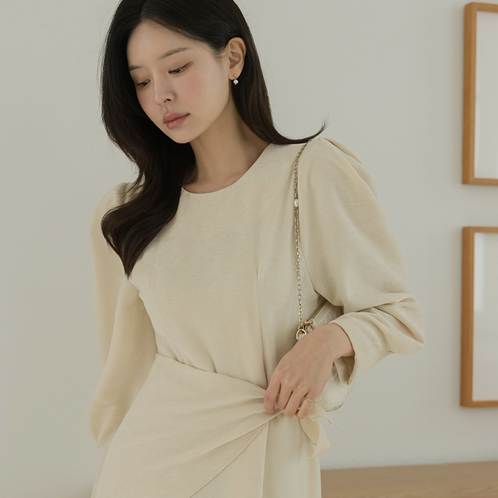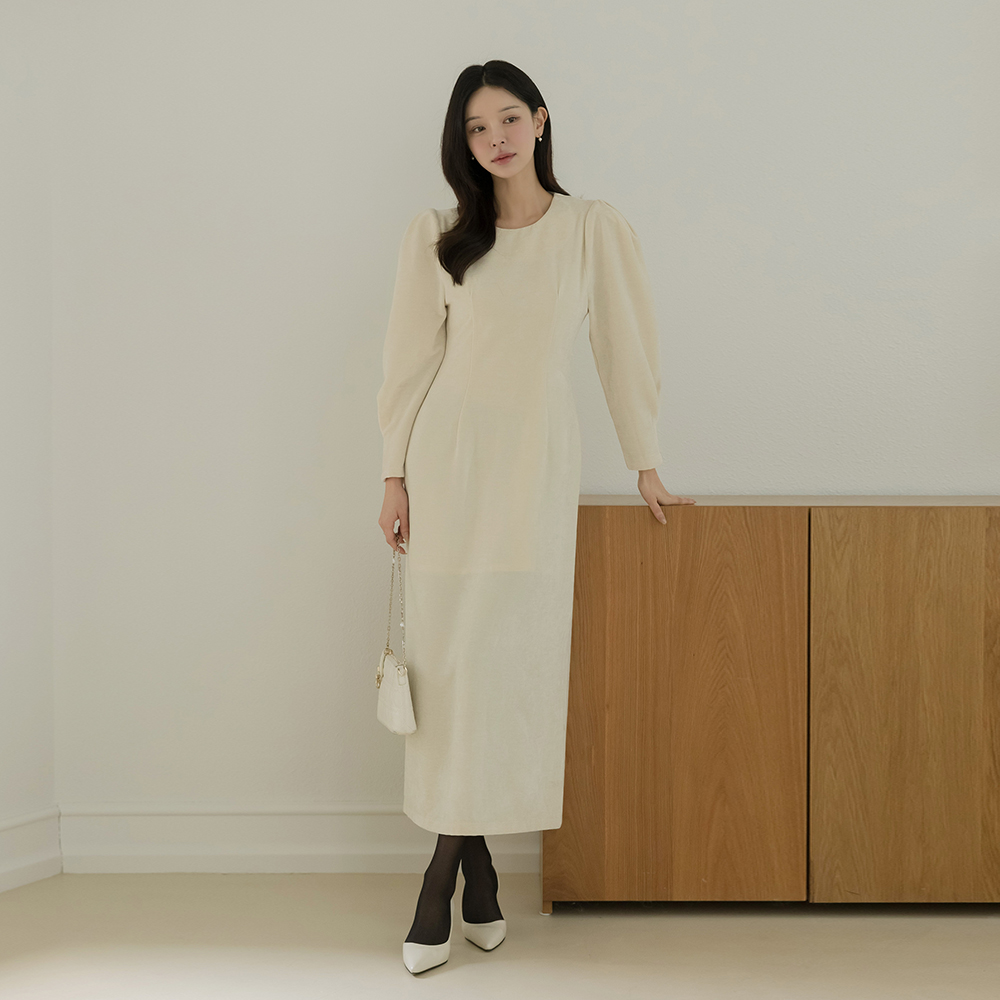 丝绒 H字型 泡泡袖 长款 连衣裙(+围巾)