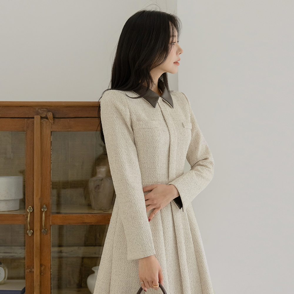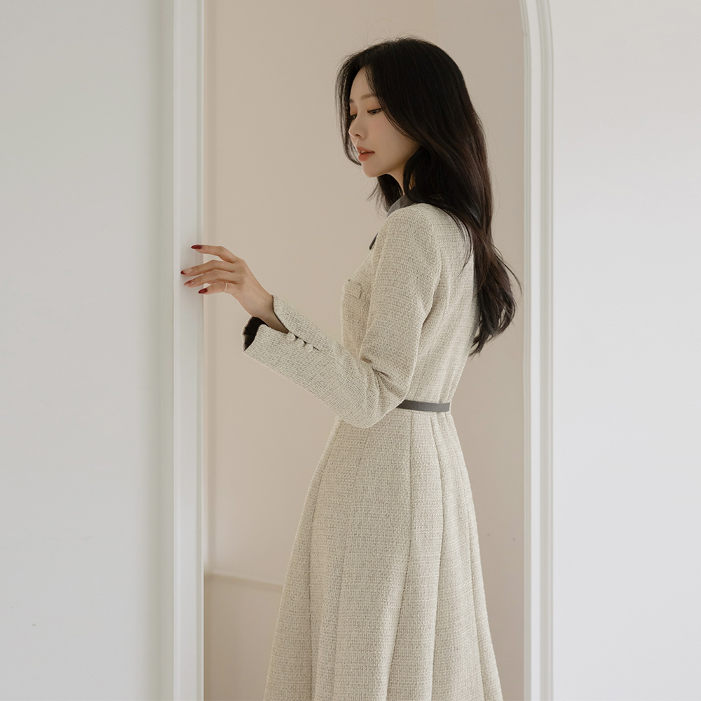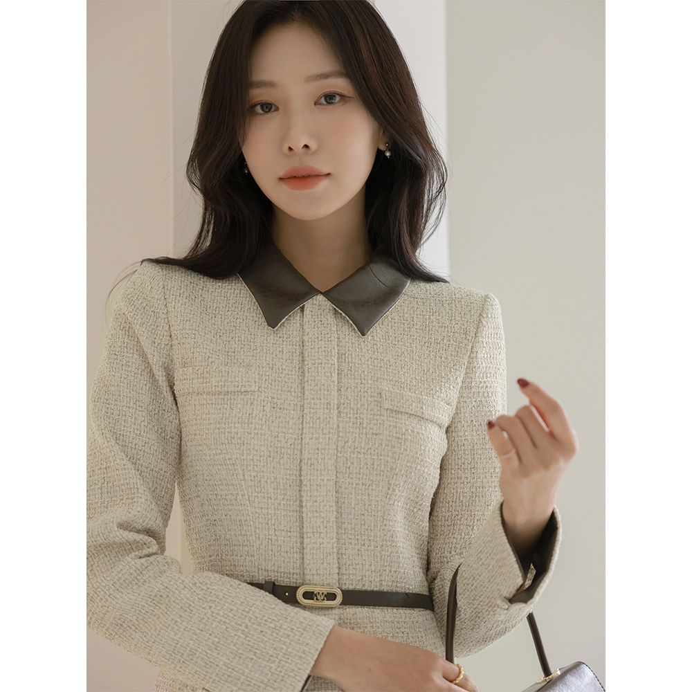 人造皮夹 配色 A字型 羊毛 粗呢 连衣裙(+腰带)