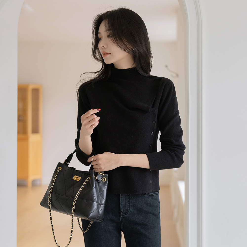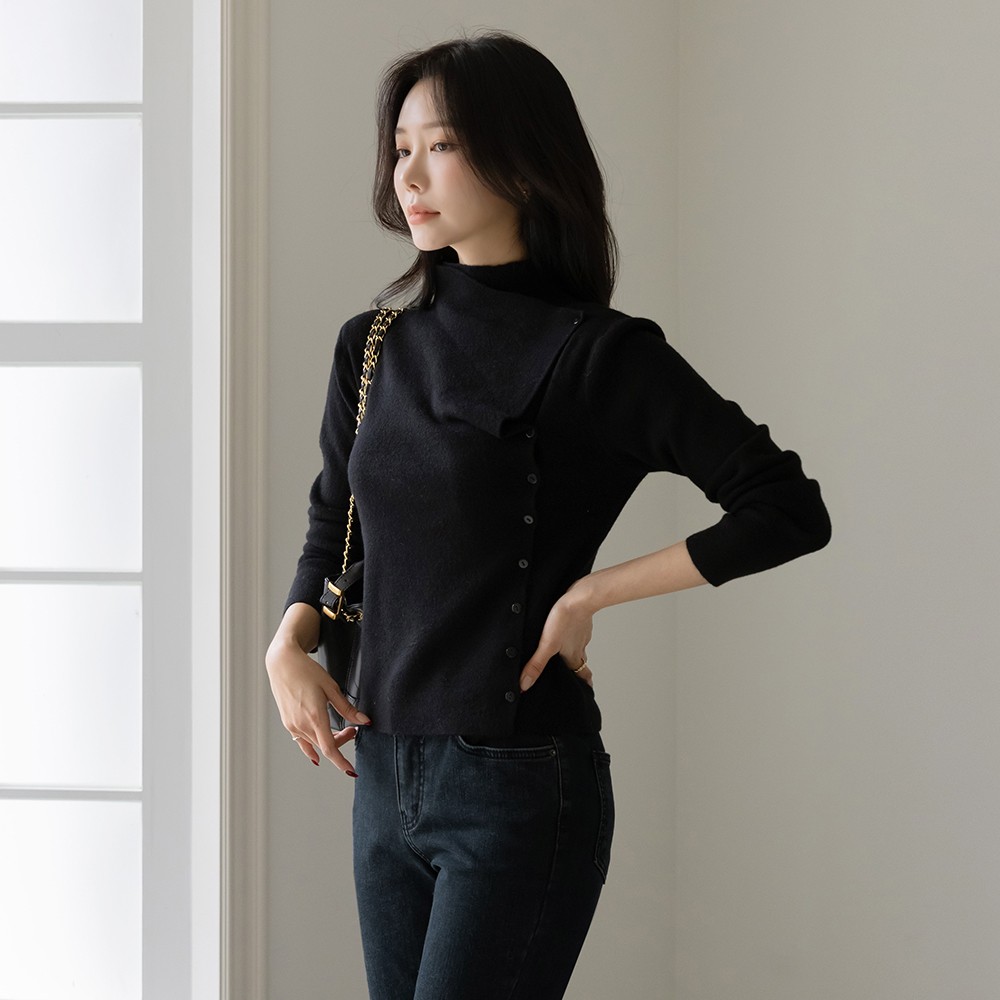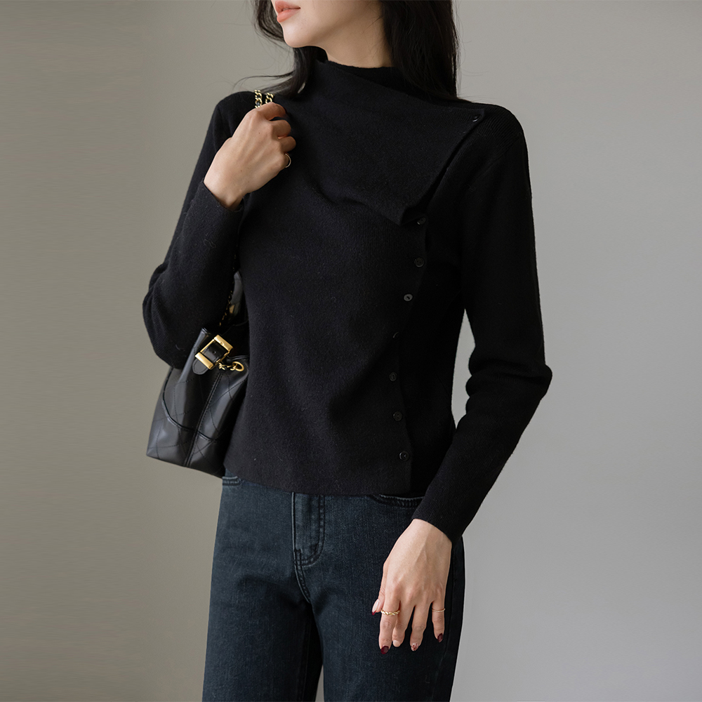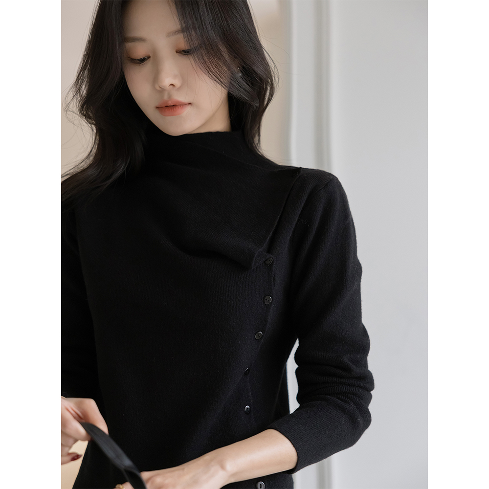 斜线 不规则 扣子 羊毛 半高领 针织衫