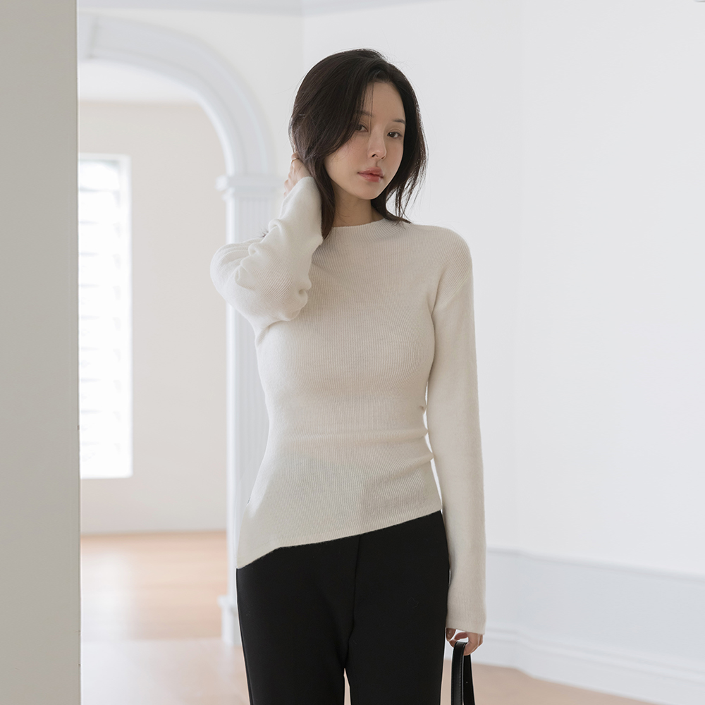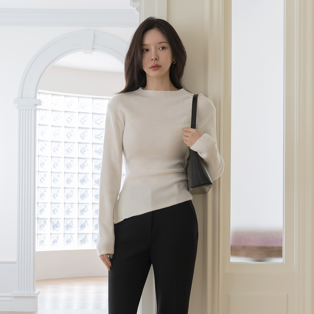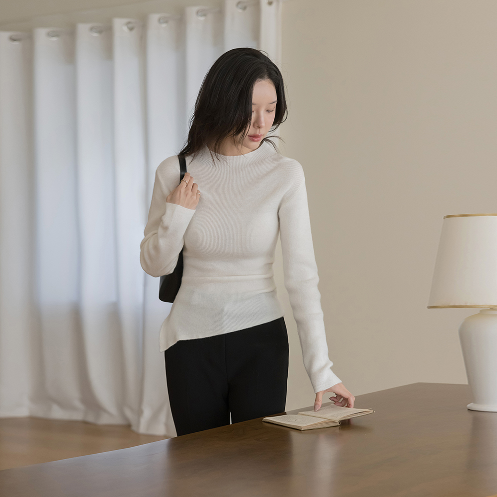 半高领 条绒 侧纽 褶皱 羊毛 不规则 针织衫