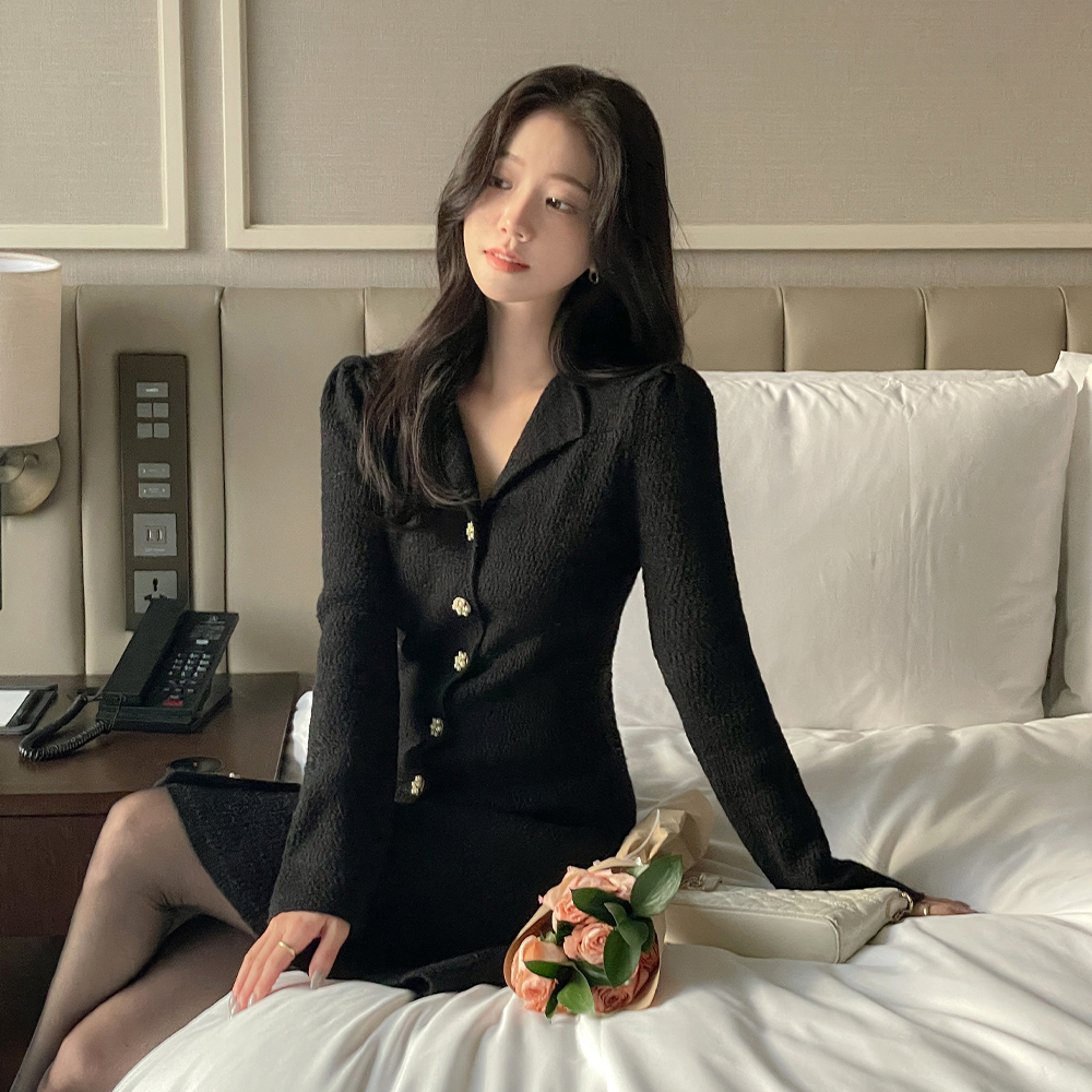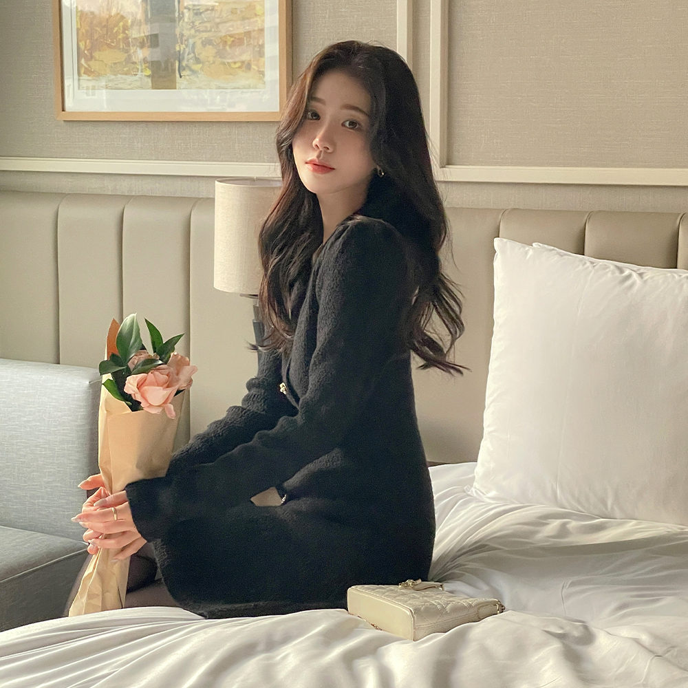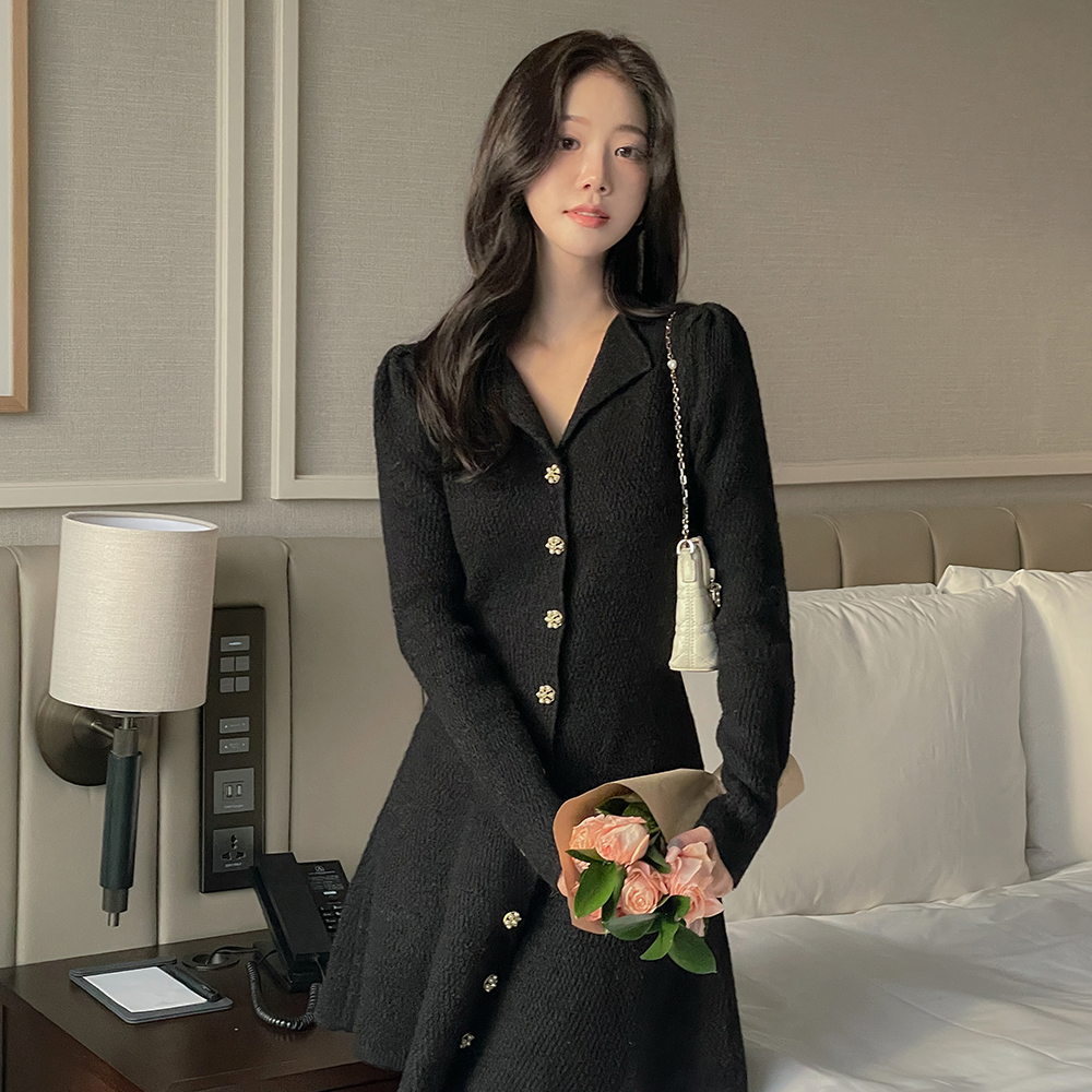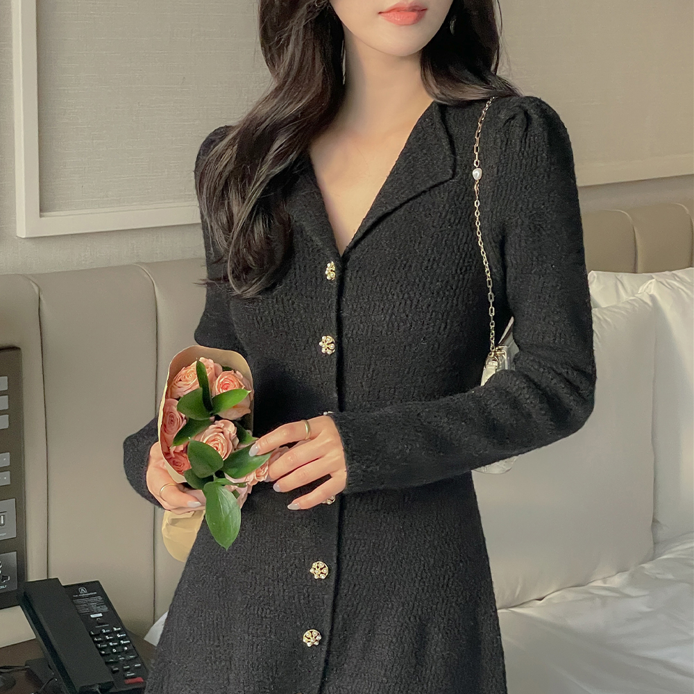 敞开式领口 泡泡袖 A字型 针织衫 迷你 连衣裙