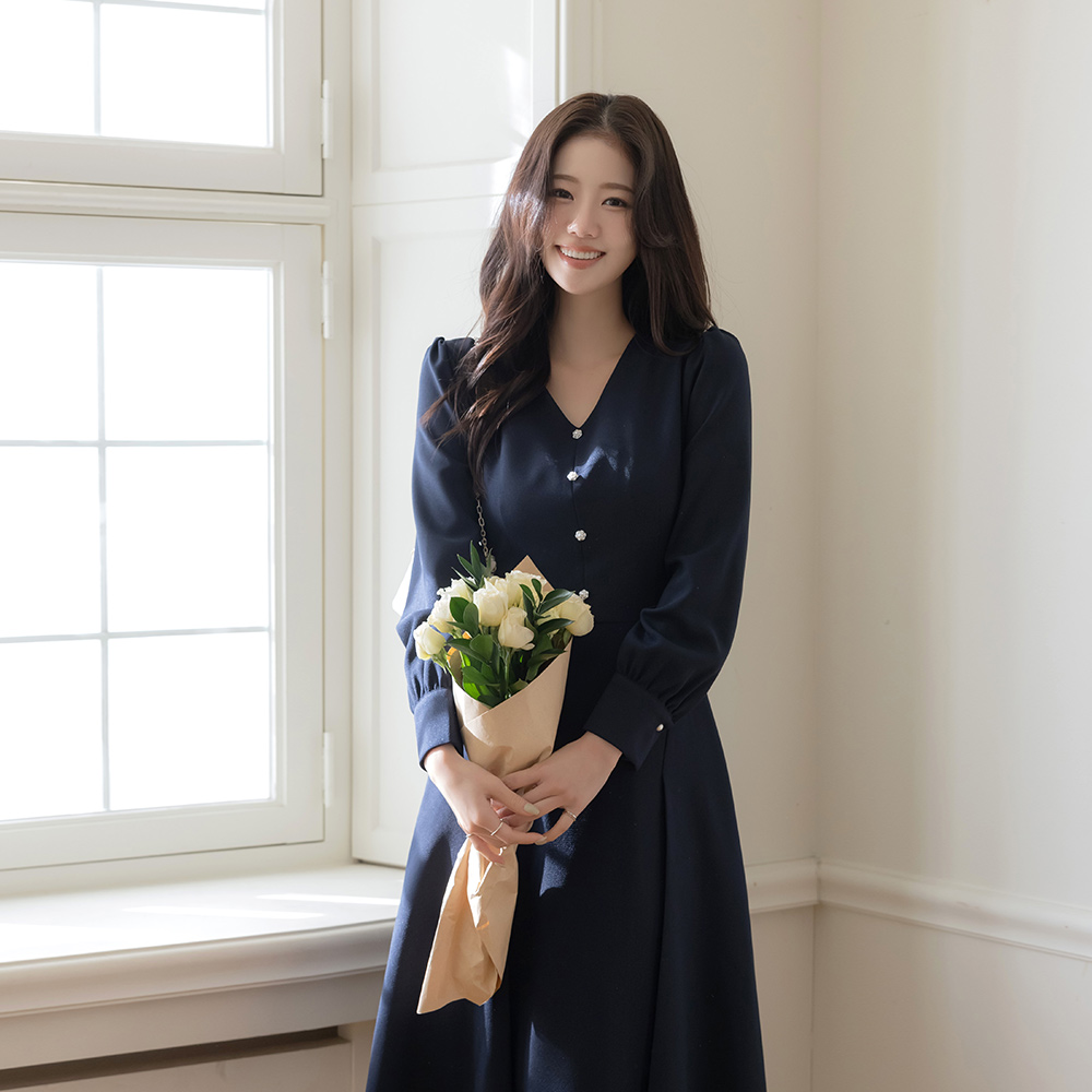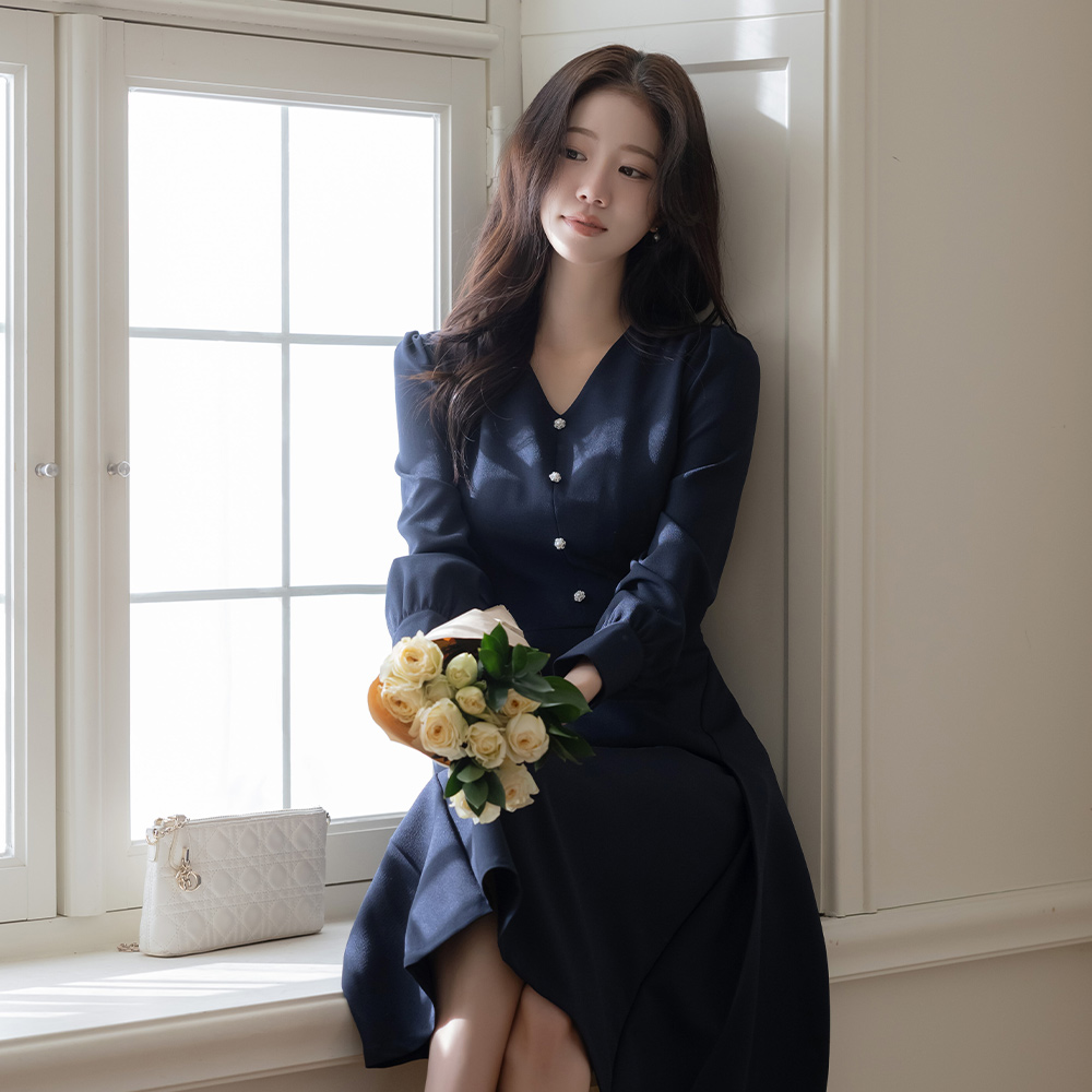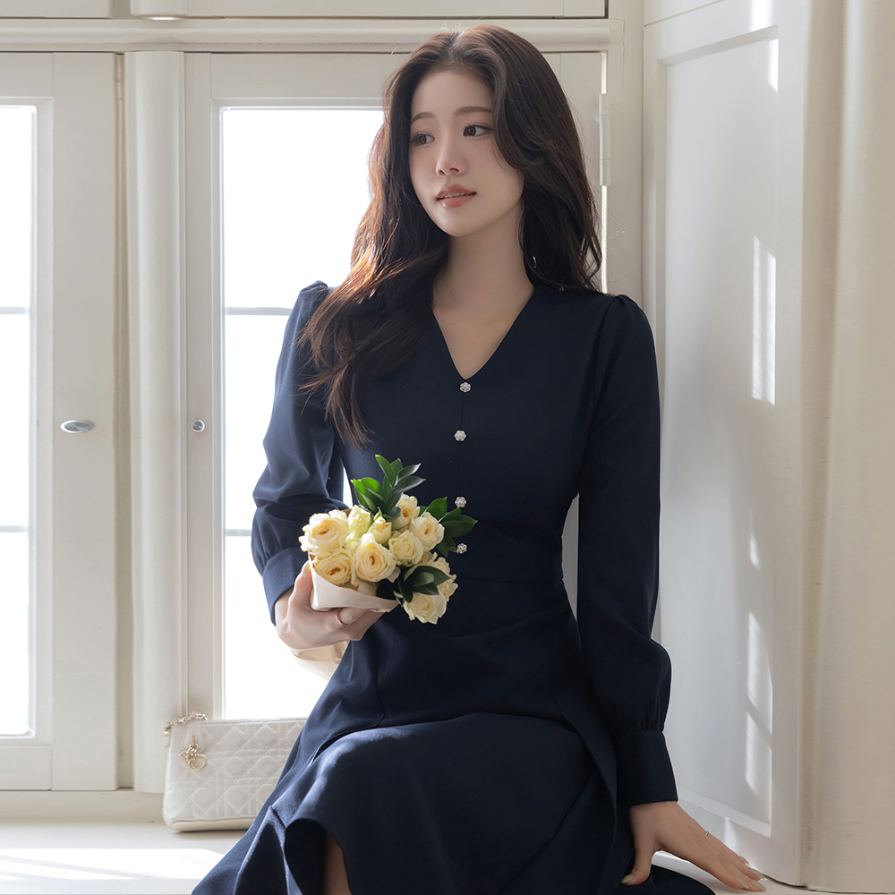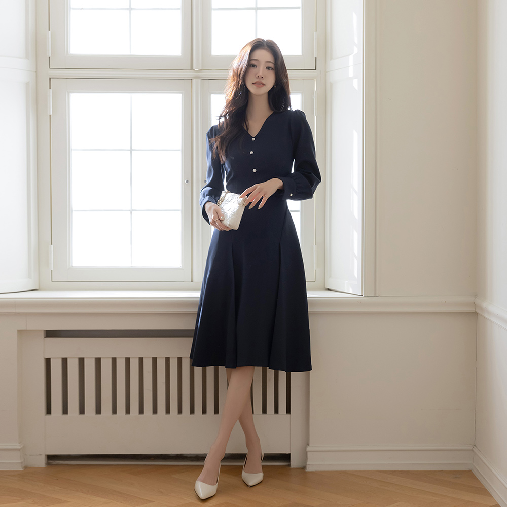 V字领 花纹 珍珠 A字型 连衣裙