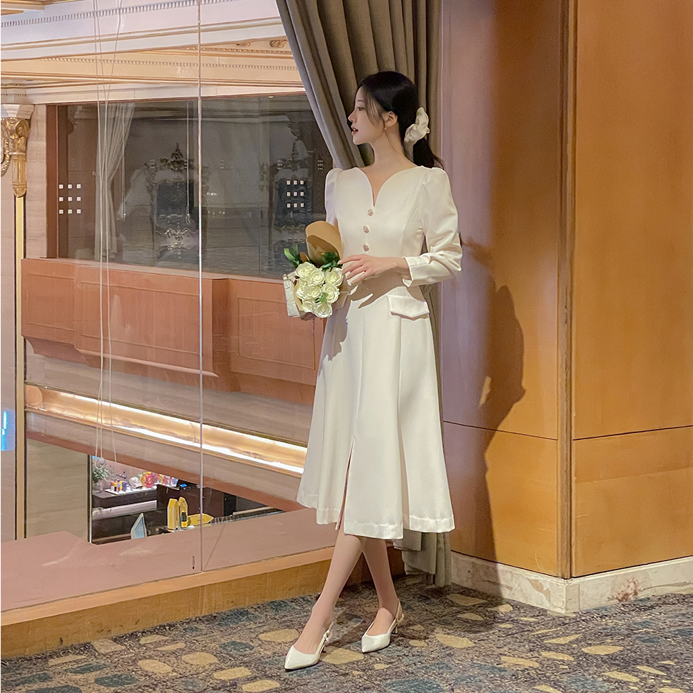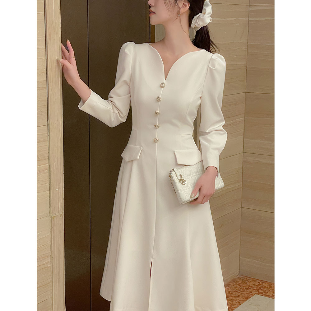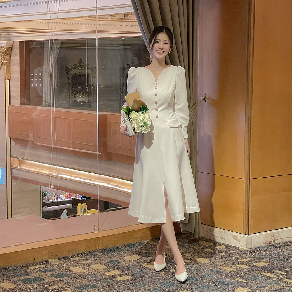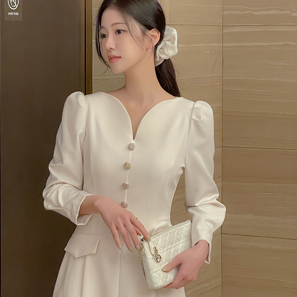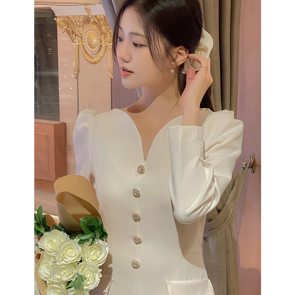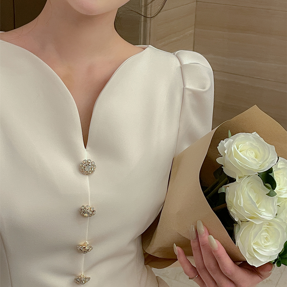 Merry 开口领子 泡泡袖 镶钻 A字型 连衣裙