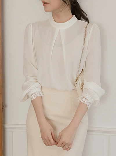 半高领 细褶 袖 蕾丝 罩衫