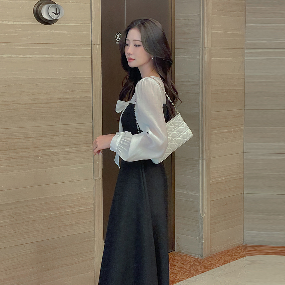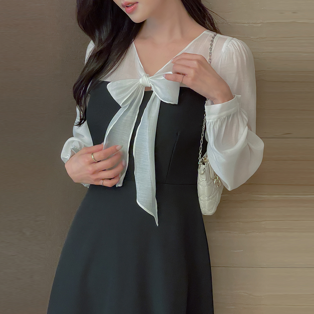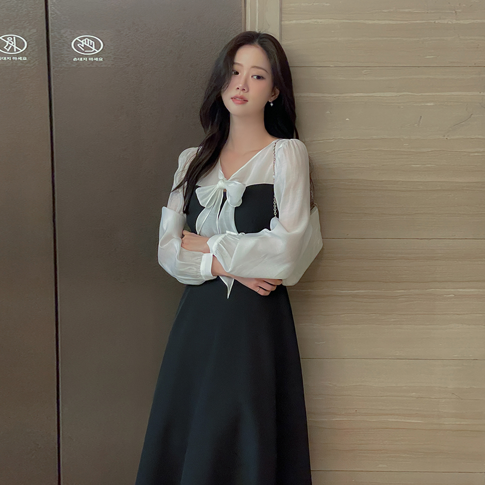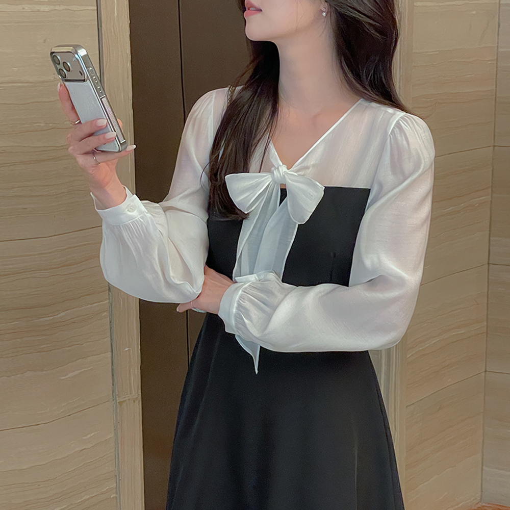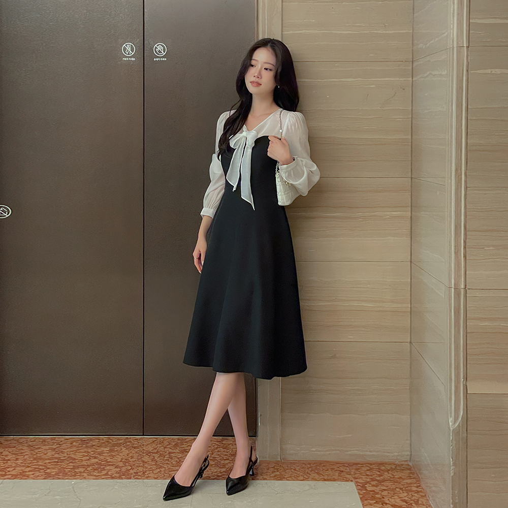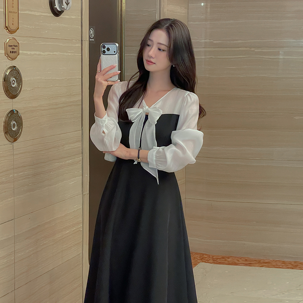 v 蝴蝶结领口 配色 A字型 连衣裙