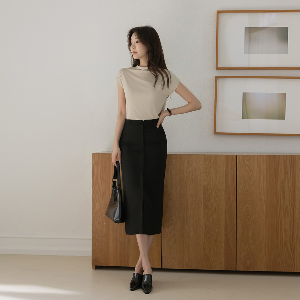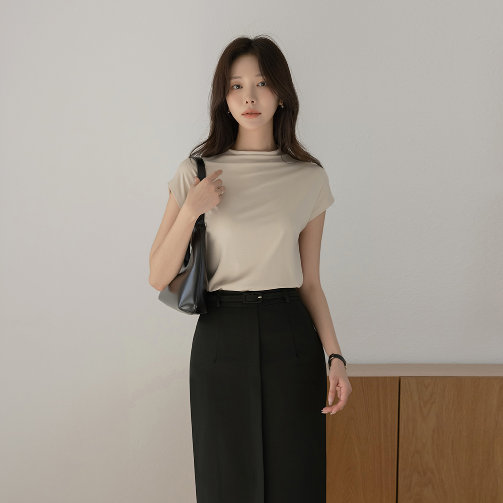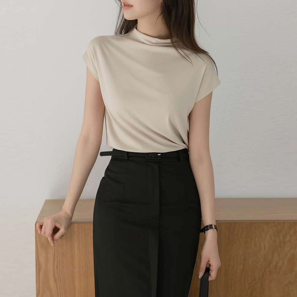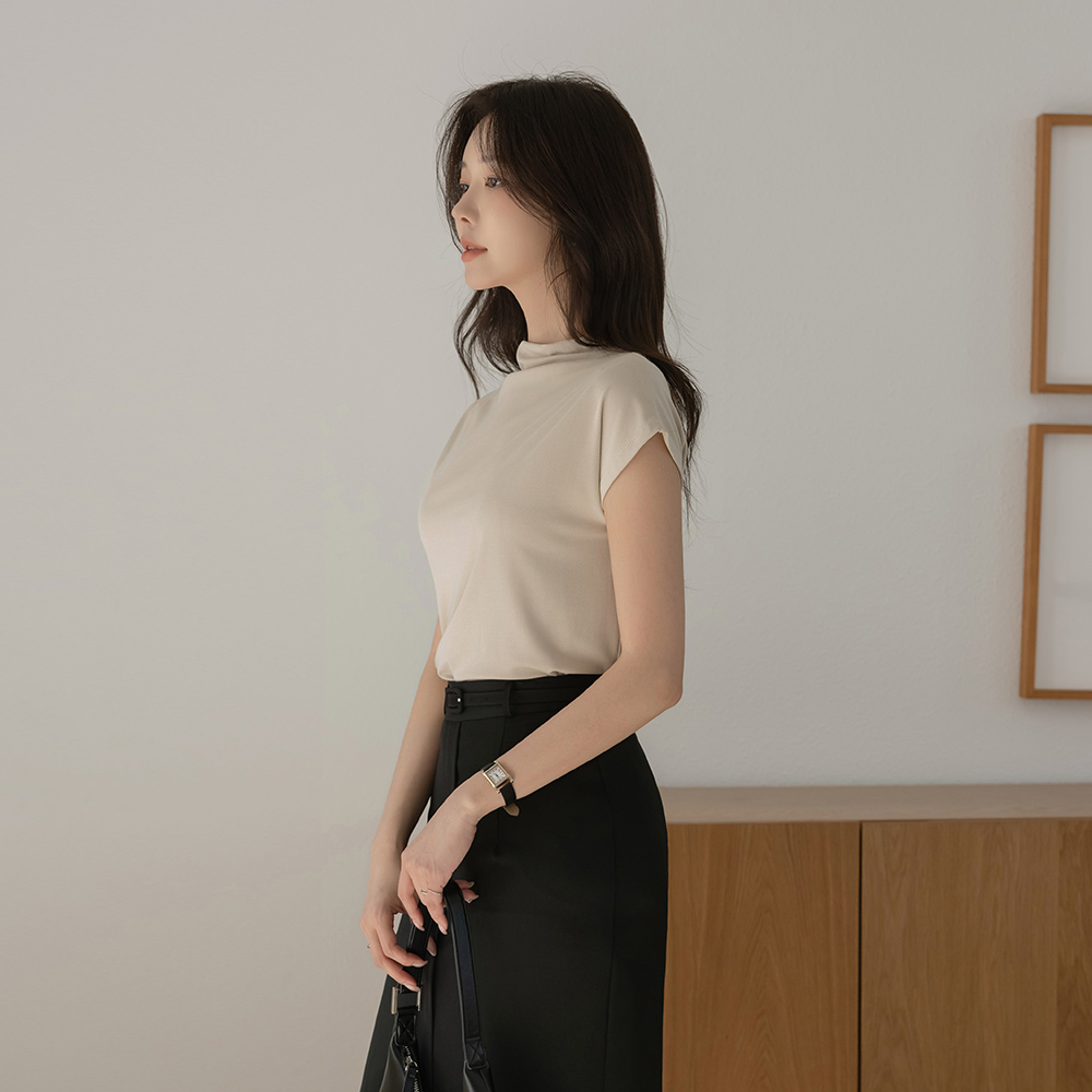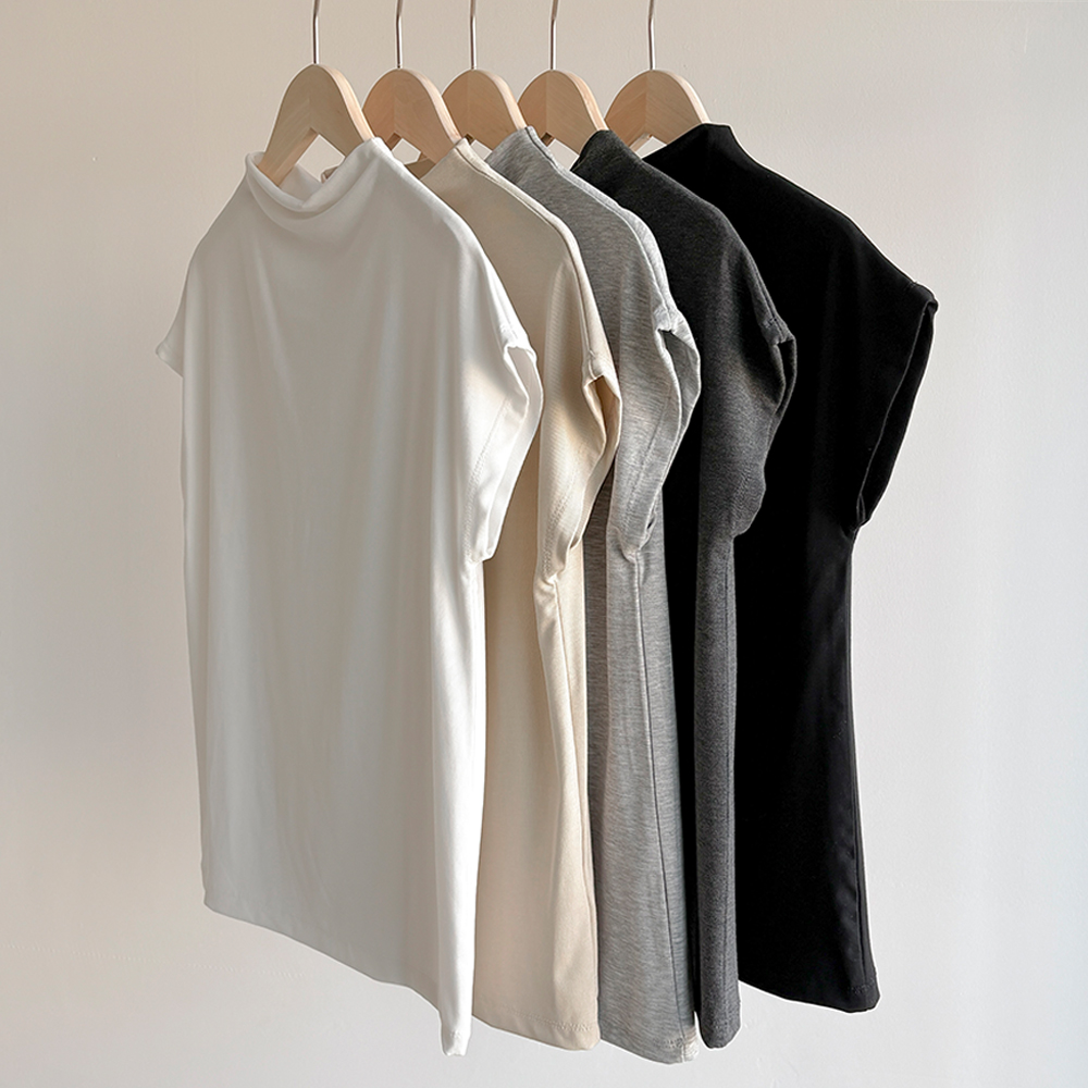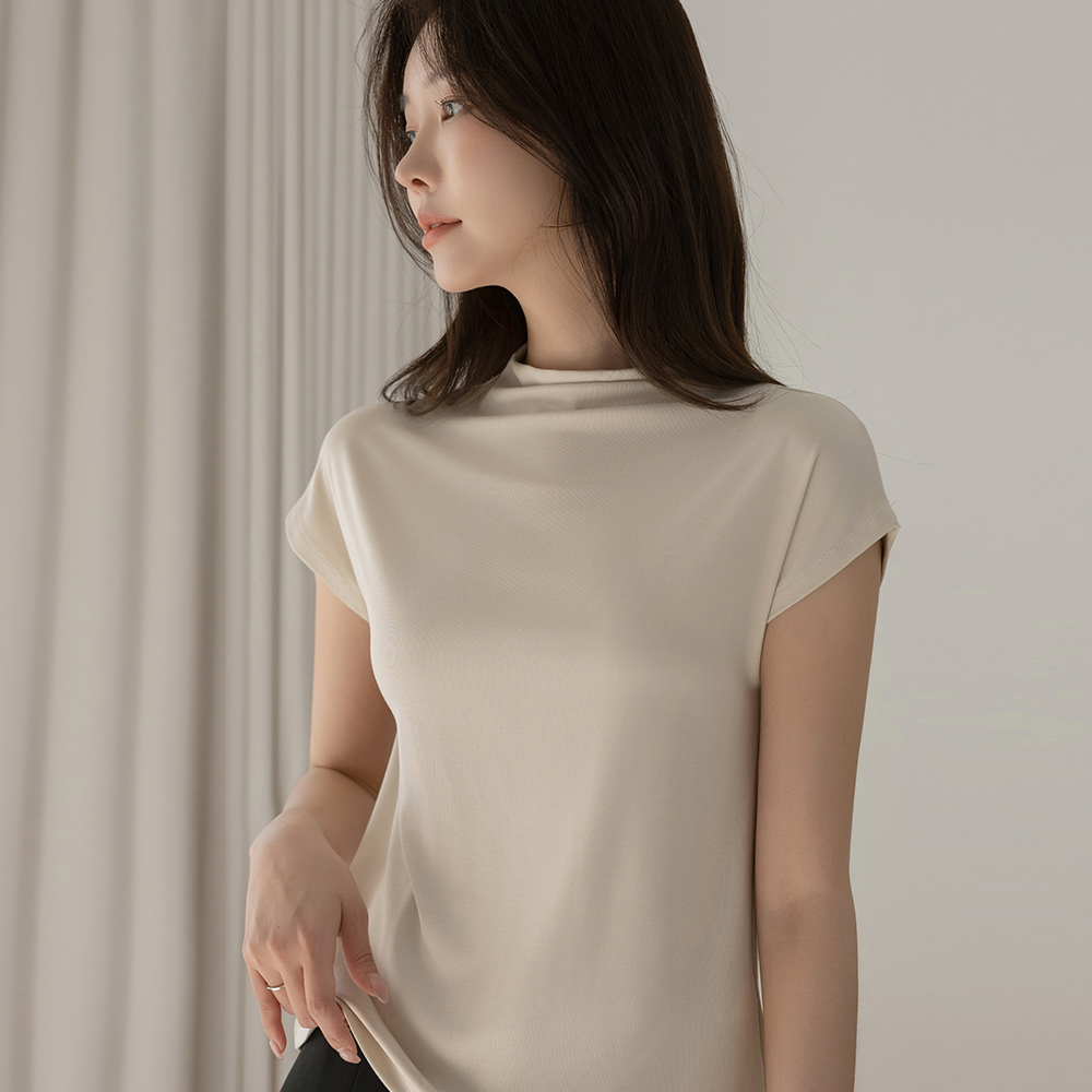 柔丝 半高领 帽檐袖 弹力 T恤衫