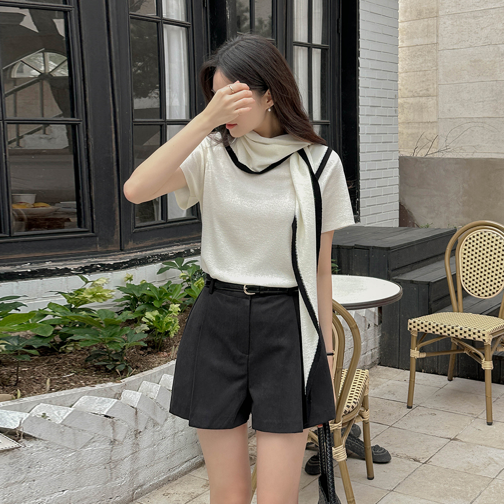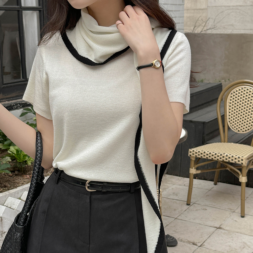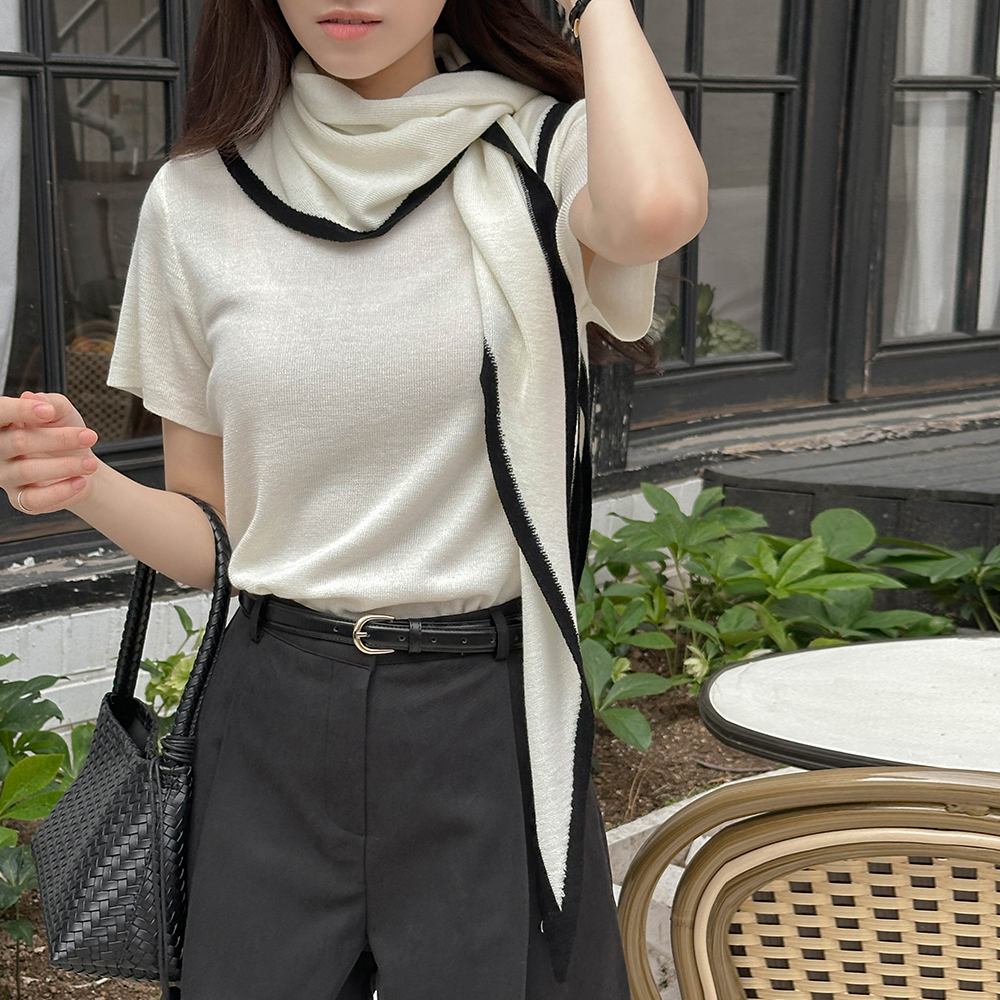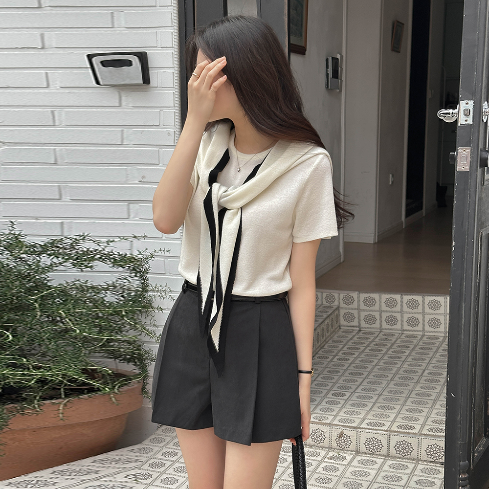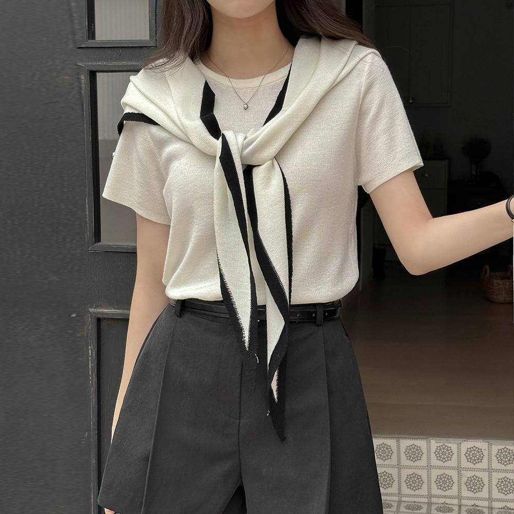 圆领 垂饰 短袖 针织衫(+披巾)