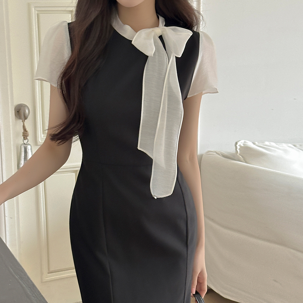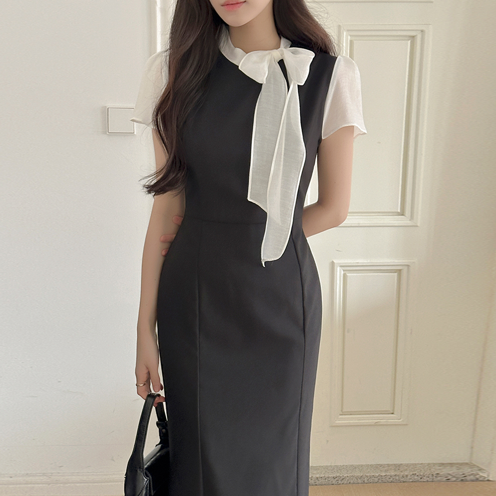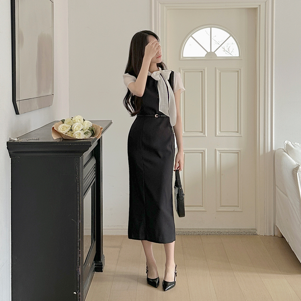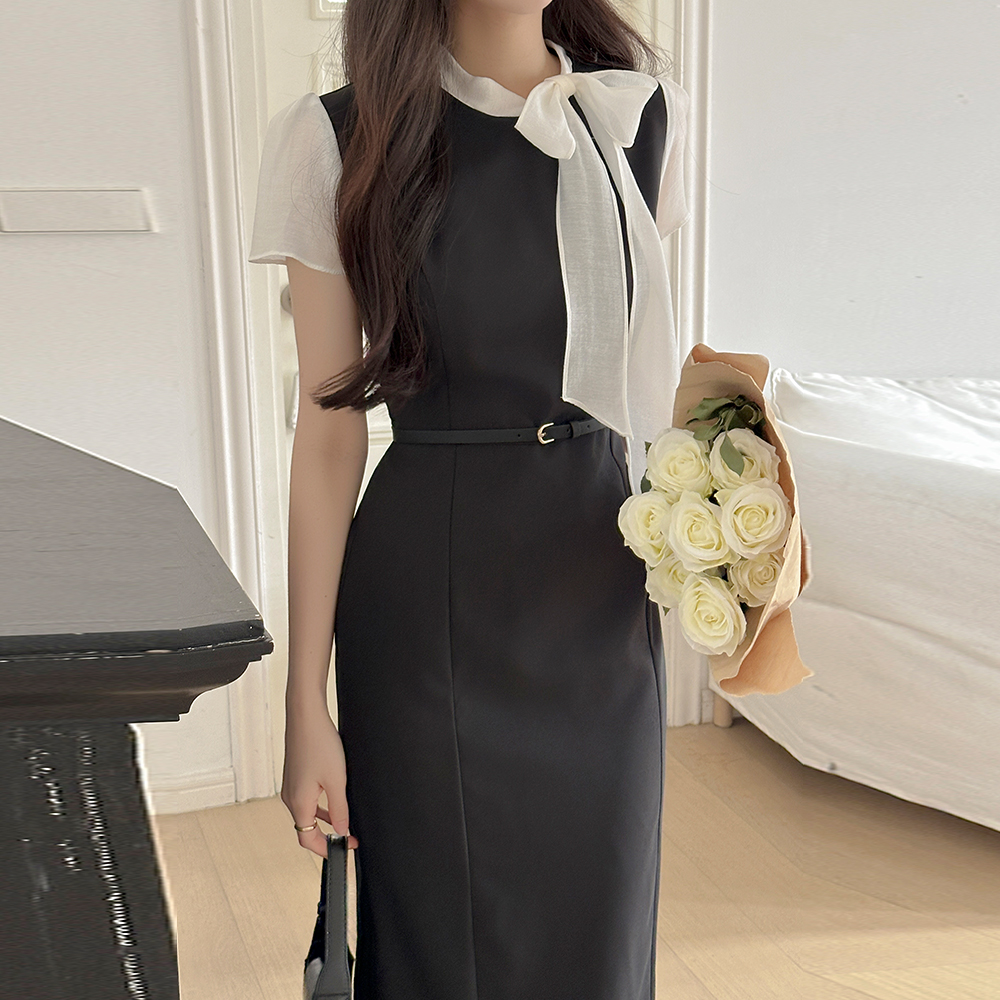 蝴蝶结领口 配色 H字型 长款 连衣裙(+腰带)