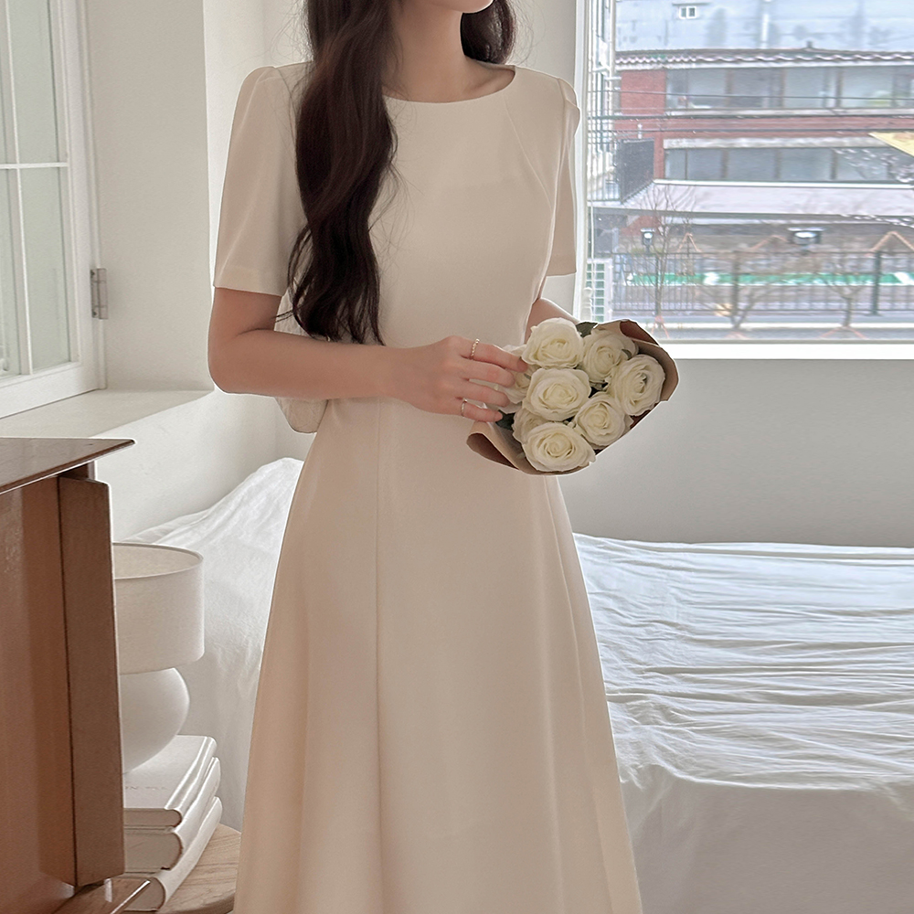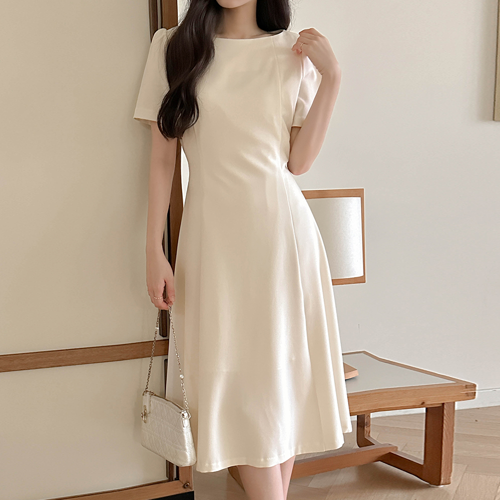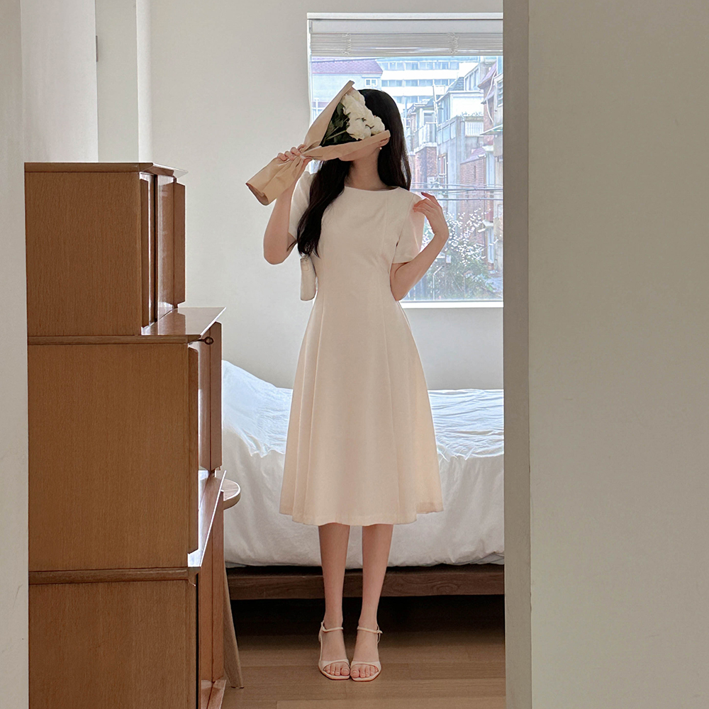 와이드넥 后面蝴蝶结 A字型 泡泡袖 连衣裙