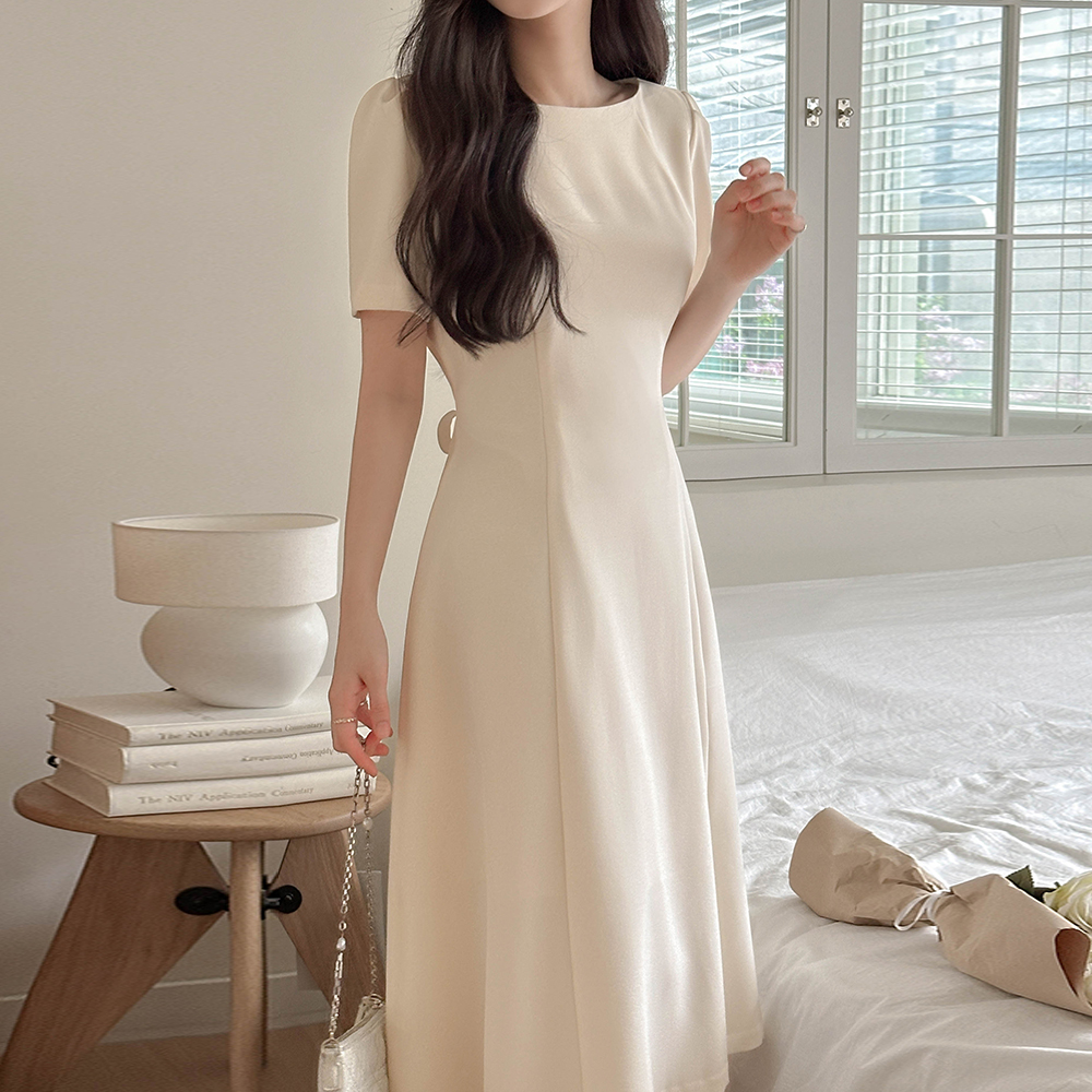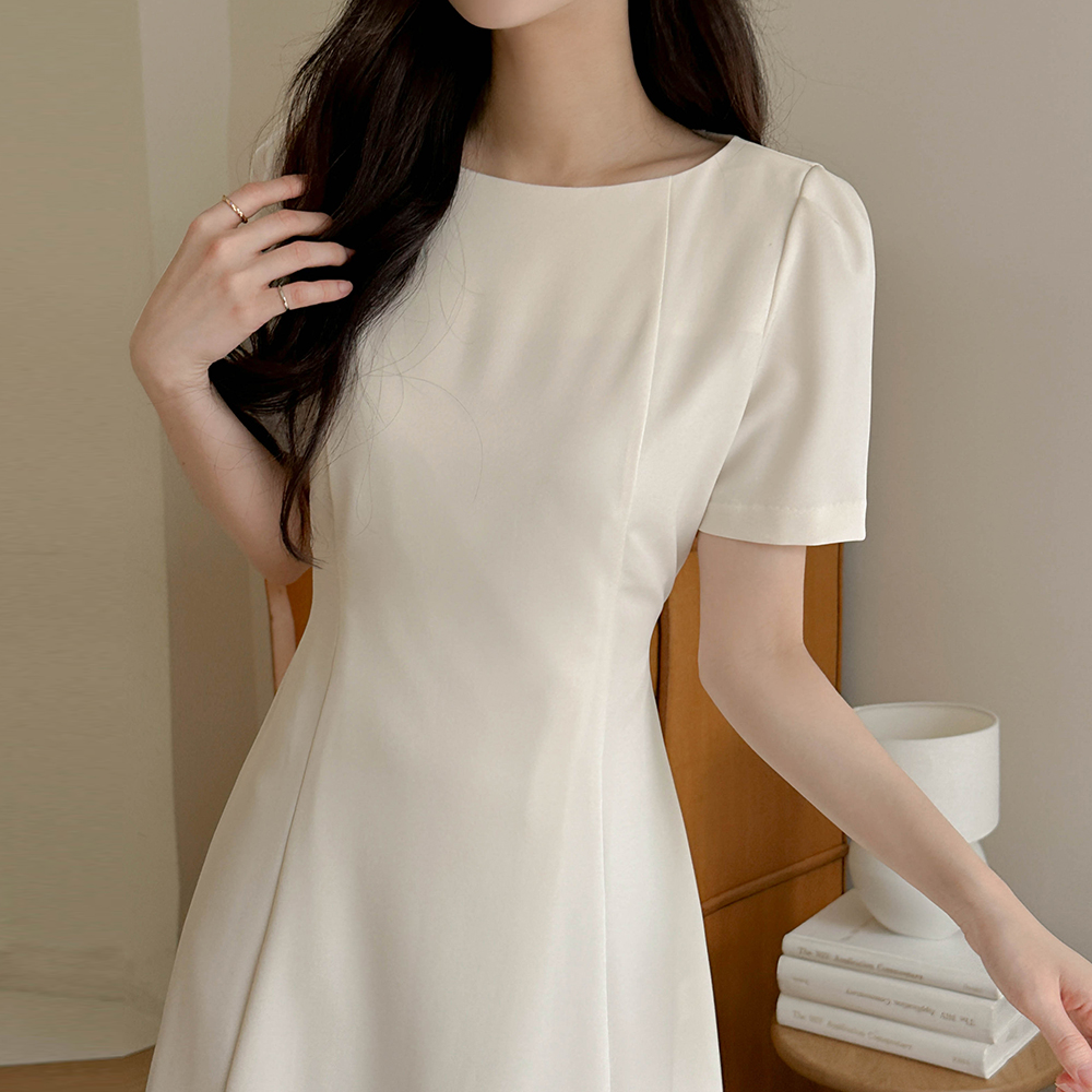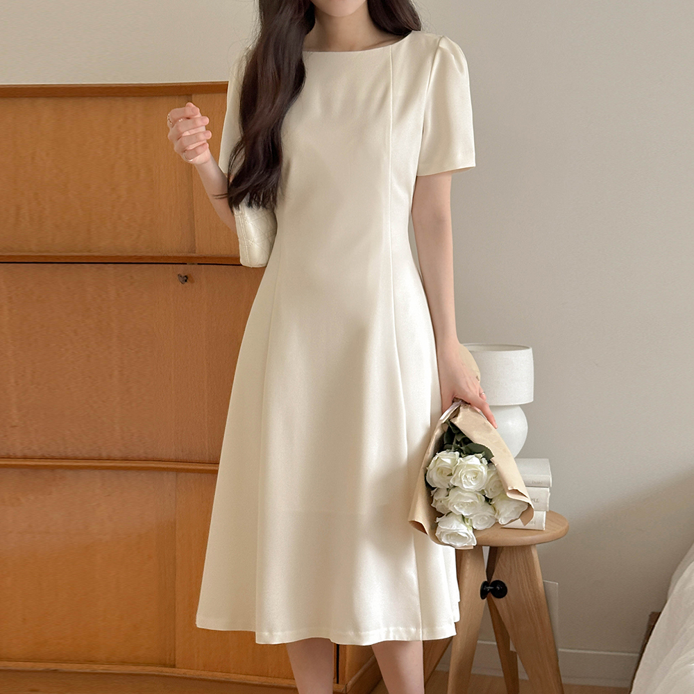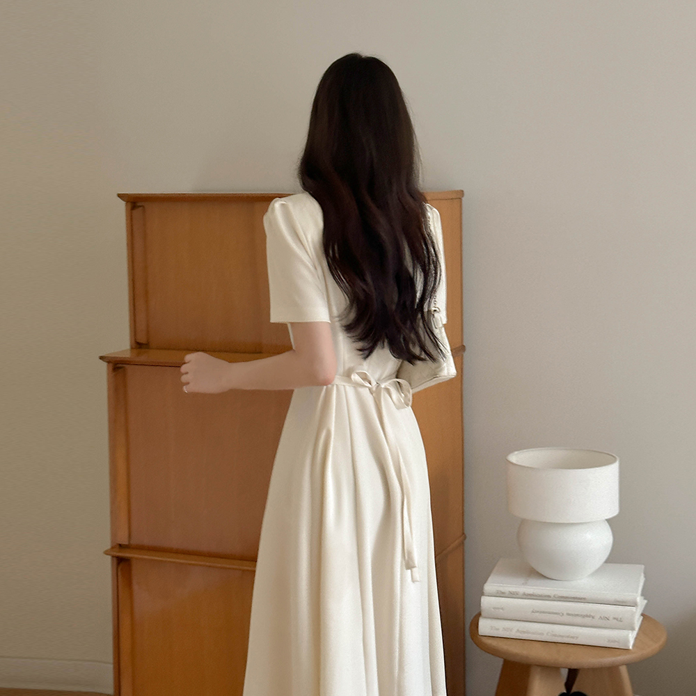 와이드넥 后面蝴蝶结 A字型 泡泡袖 连衣裙