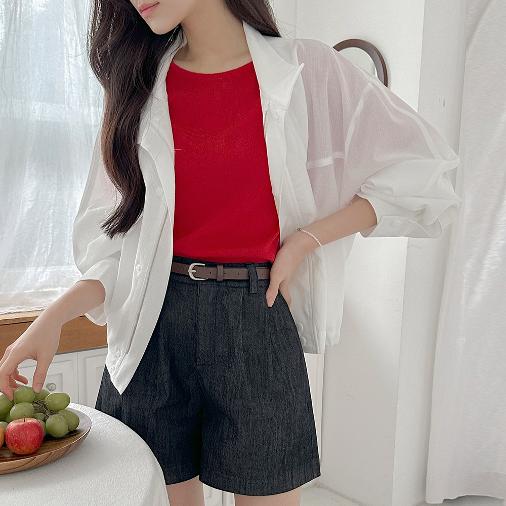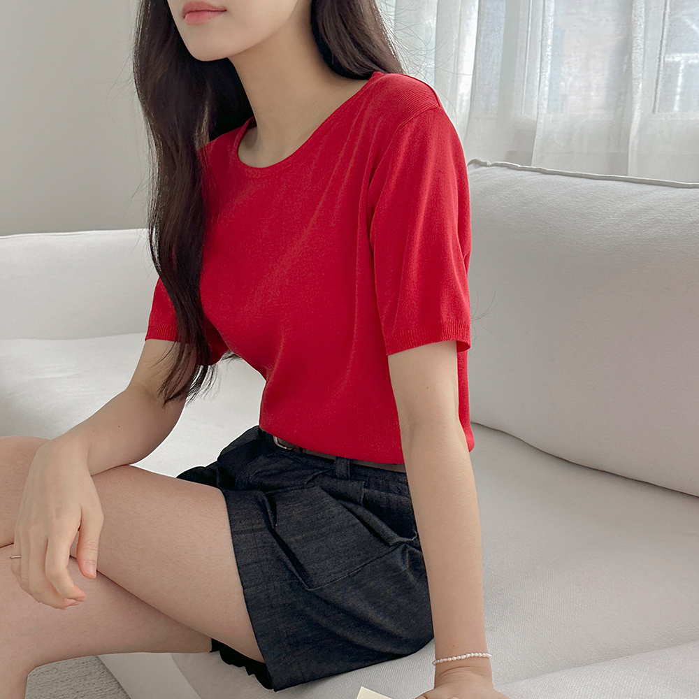 领子 반버튼 亚麻 条绒 短袖 针织衫