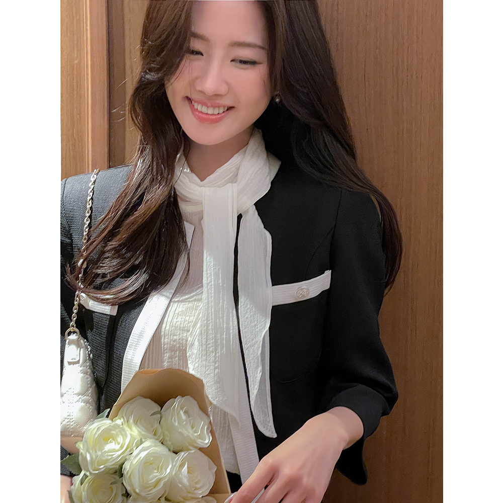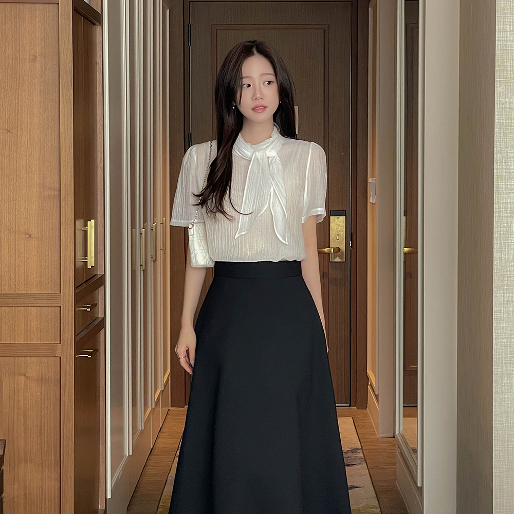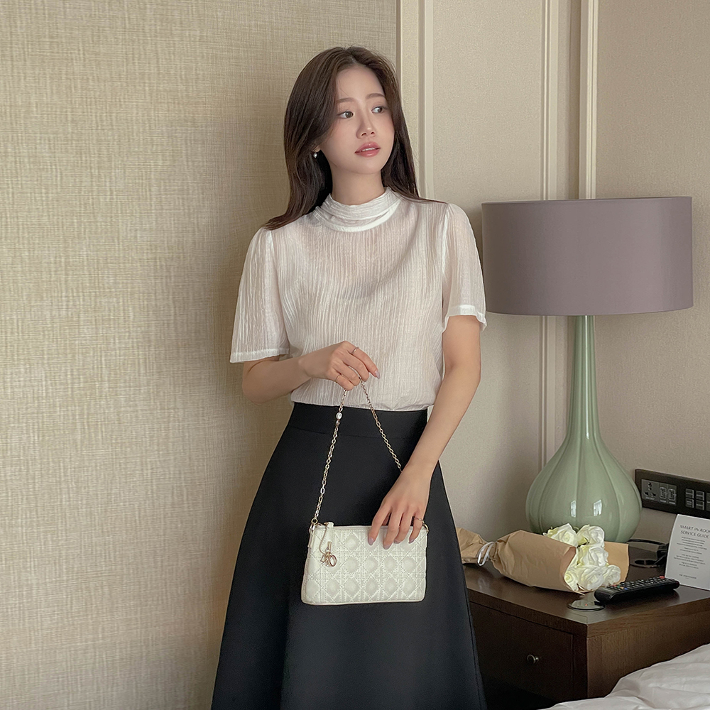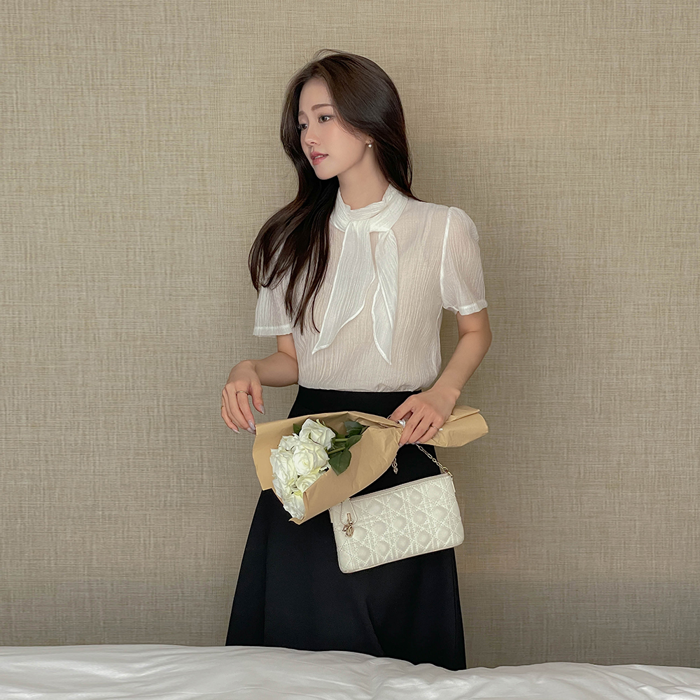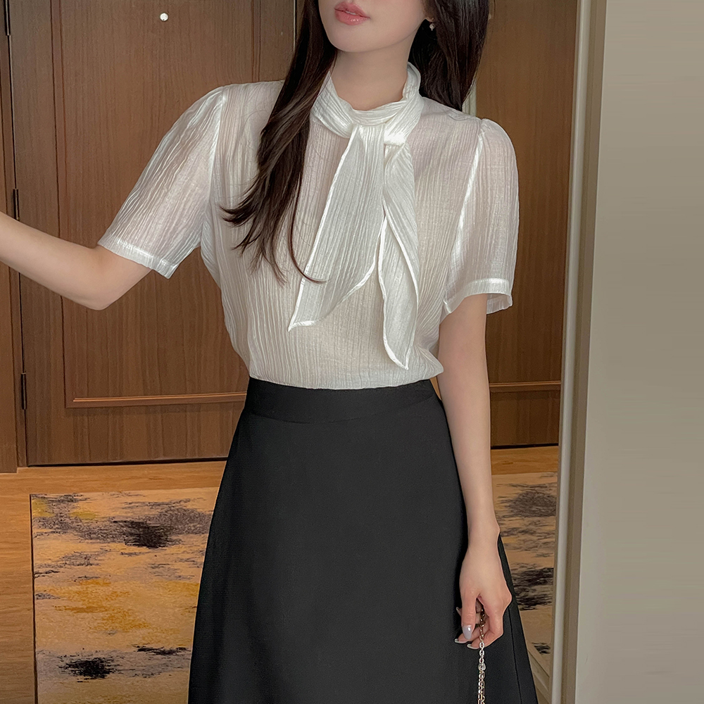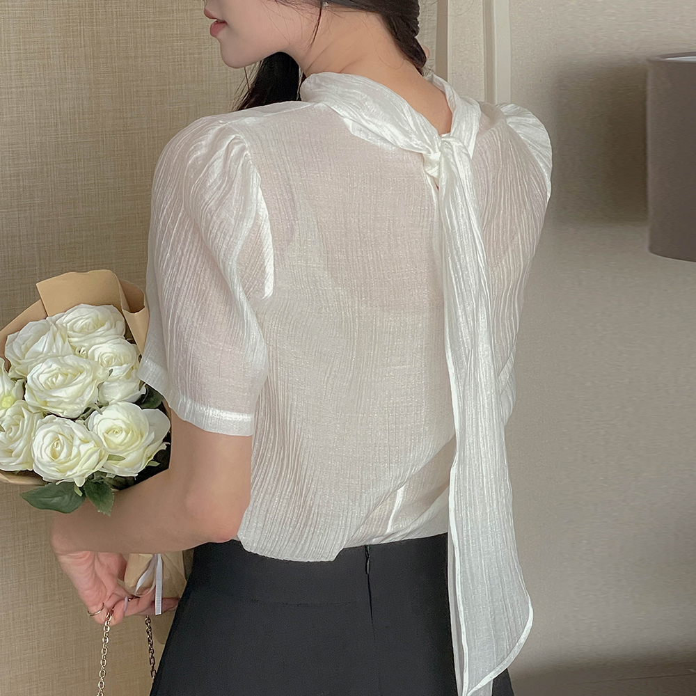 围巾领 珍珠 透视 短袖 罩衫