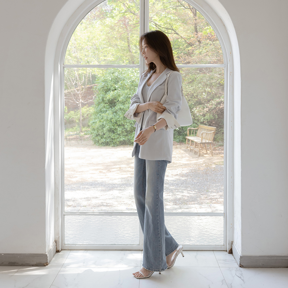 底端 裁剪 水洗 喇叭 弹力 牛仔色 裤子