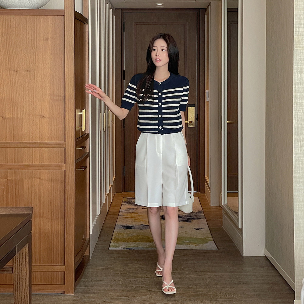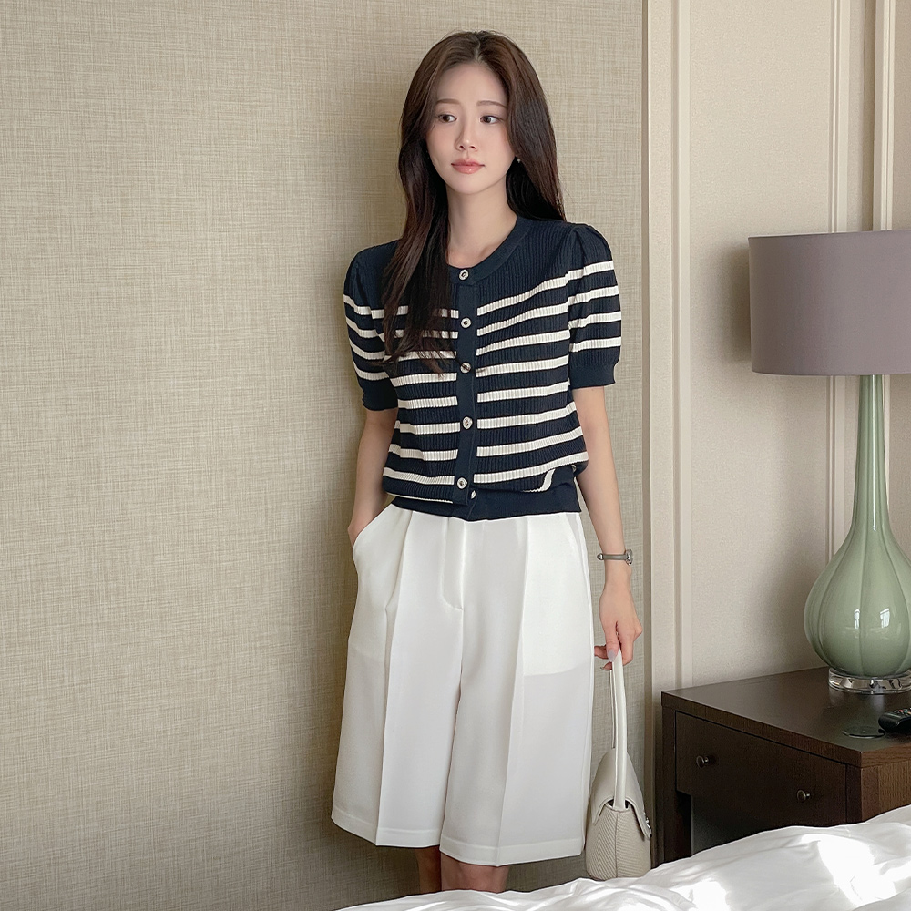 宝石 扣子 横条纹 短袖 开衫